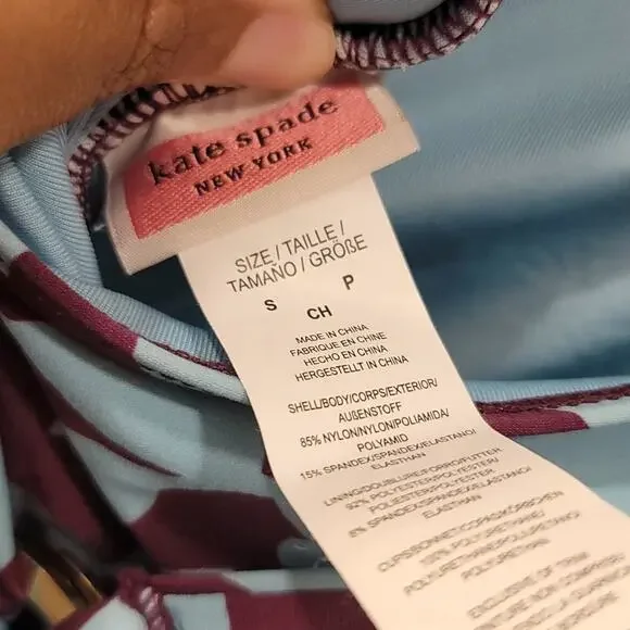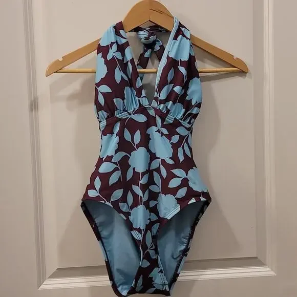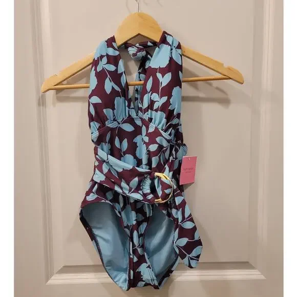 Kate Spade Swimsuit with Plunging Halter Floral-print Belted Women's Swimsuit In Cabernet MultiCondition: NWTSize: Small (4/6 see size chart photo)This plunging one-piece takes a classic modest swimsuit up a notch with a gold ring belt that can be tied in the front or the back. Adjustable halter ties behind the neck. Removable soft cups provide additional support. Full coverage bottom make this perfect for your next family vacation. Elegant Swimwear, Material: 85% nylon, 15% spandexHand wash, hang dry.Modest swim, Soft Swim, Plunging One Piece, Modest One Piece, Sexy One Piece, Mom swim, swimsuit for vacation with parents, swimsuit for vacation with inlaws, swimsuit for vacation with kids, Family friendly swim, Mothers Day, Gifts for Mom Kate Spade S70342a cabernet (506)UPC 193144509307
