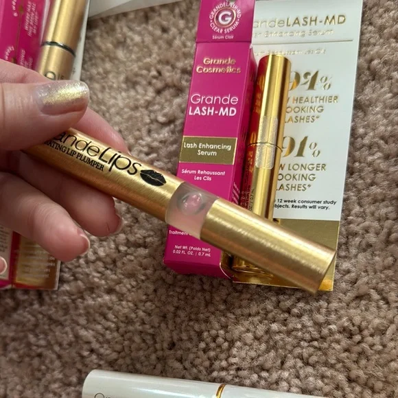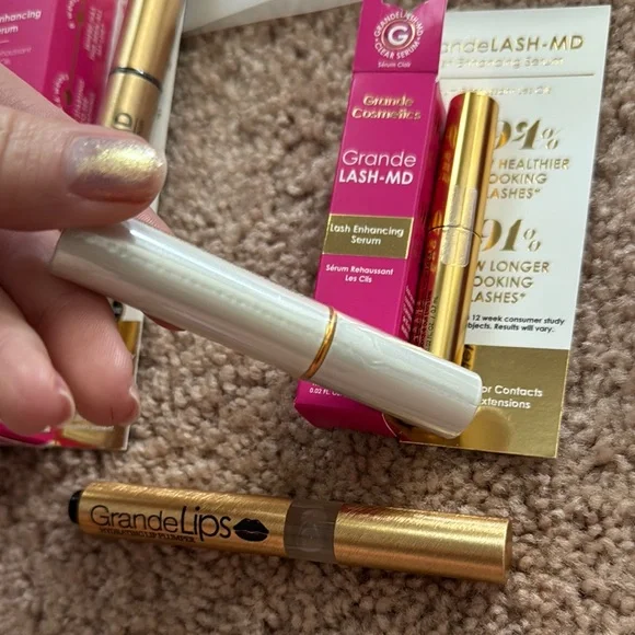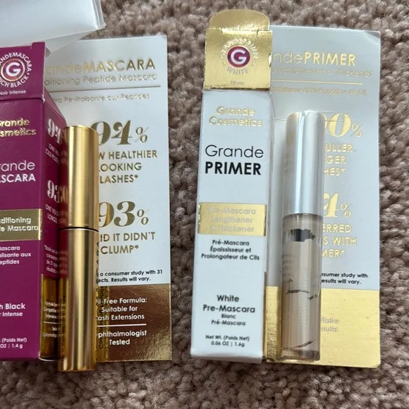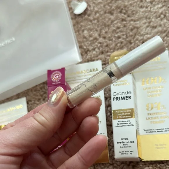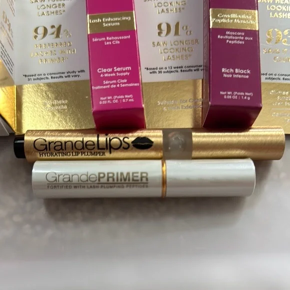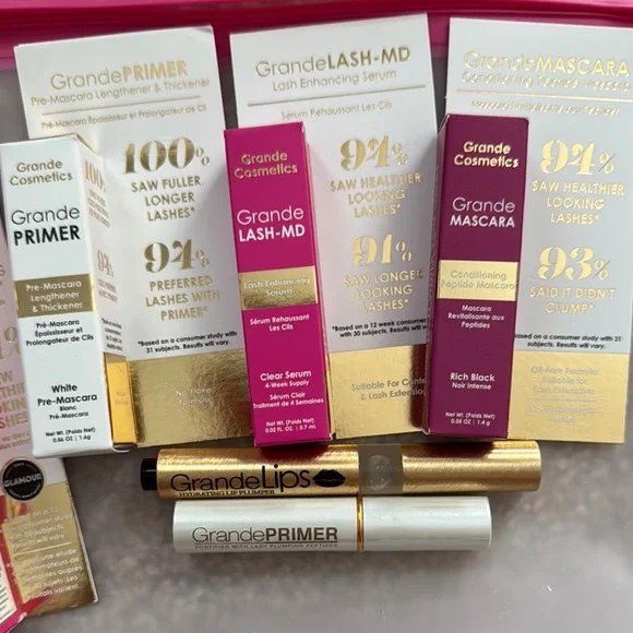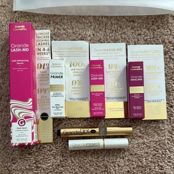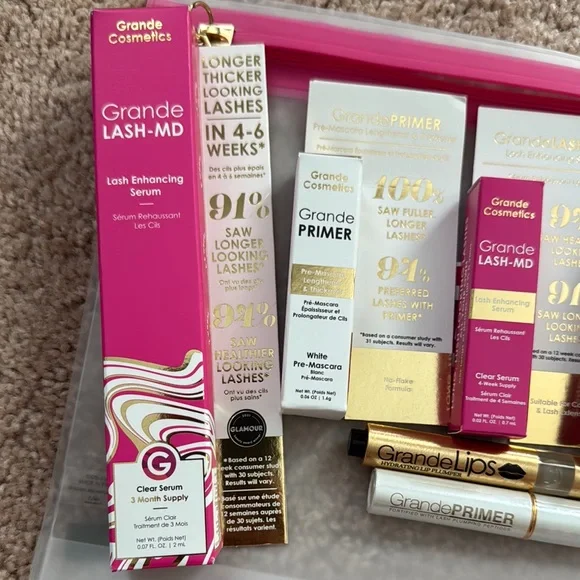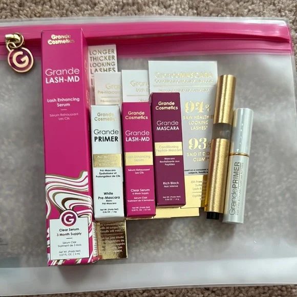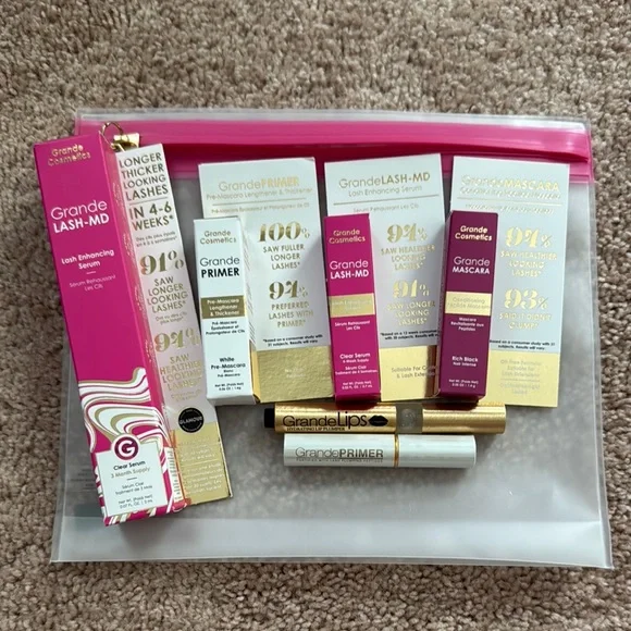 Elevate your lash game with this exquisite collection (thxAI lol).Grande Cosmetics bundle - Grande Lash-md full size (3 month supply $68) & sample/travel 4 week supply, sample/travel grand primer white pre-mascara, grande mascara conditioning peptide mascara in rich black, grande primer fortified with last plumping peptides (sealed with no box), grande lips hydrating lip plumper ($28), clear, also no box.Plus clear zip travel bag Check pics - I don’t always open product boxes, but have had one sale of this brand returned before because the product was dry, so see photos of seals and the primer in particular.I received all of these as samples with other products, so cannot verify expiration dates.Reflected in price.*check out my other listing, discounts on bundles and offers are welcome!