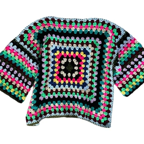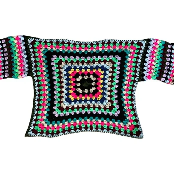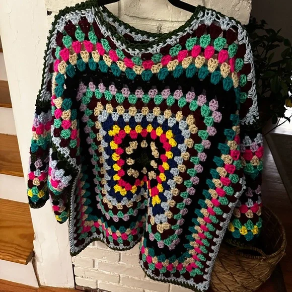 This cozy, one-of-a-kind sweater is a true work of art! Lovingly handcrafted with vibrant, multicolored granny squares, it’s the perfect blend of vintage charm and modern style. Made with soft, high-quality yarn, this sweater is both comfortable and eye-catching. Ideal for layering in cooler weather, it’s sure to be a statement piece in your wardrobe. Each square is unique, making this sweater a truly special find. Perfect for anyone who appreciates the beauty of handmade fashion!