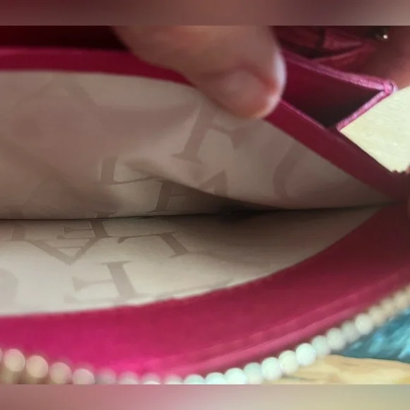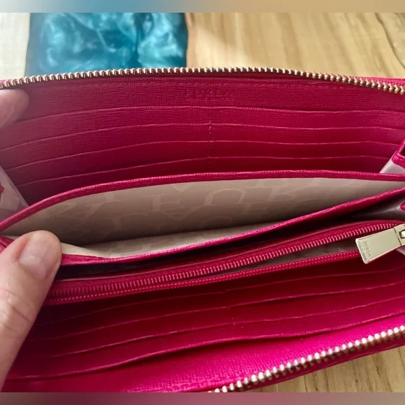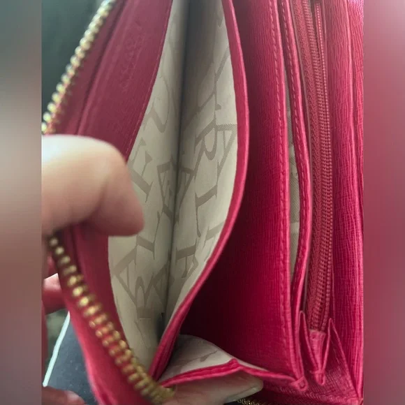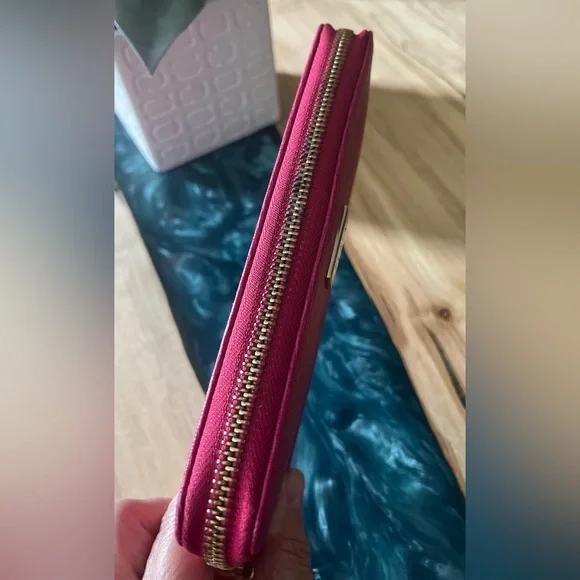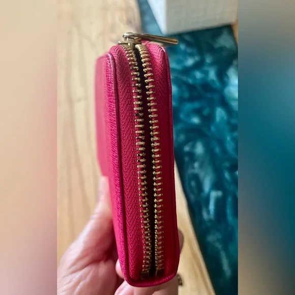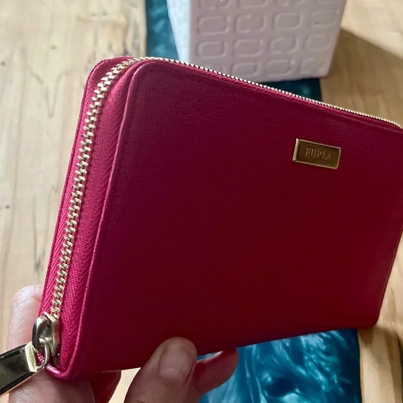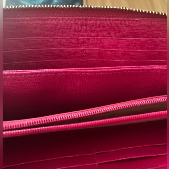This striking Pink wallet from Furla is crafted from textured saffiano leather and features a sleek metallic accent, making it a bold accessory statement. Its long rectangular shape is perfect for organizing essentials with style. Ideal for those who appreciate a blend of elegance and functionality. Minimal signs of wear.
