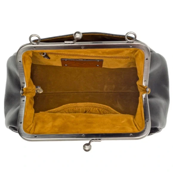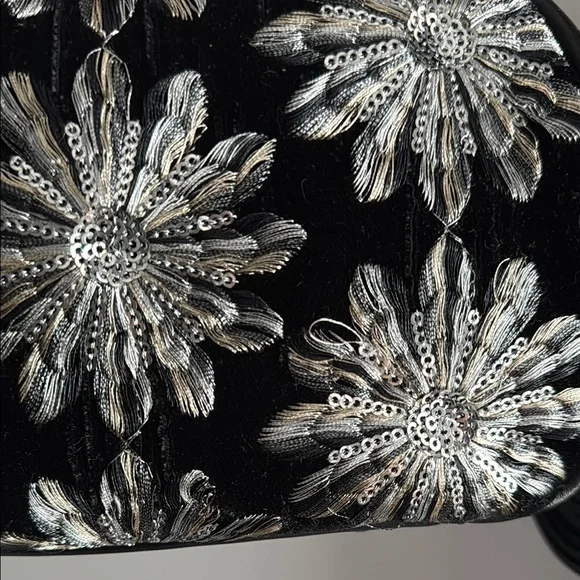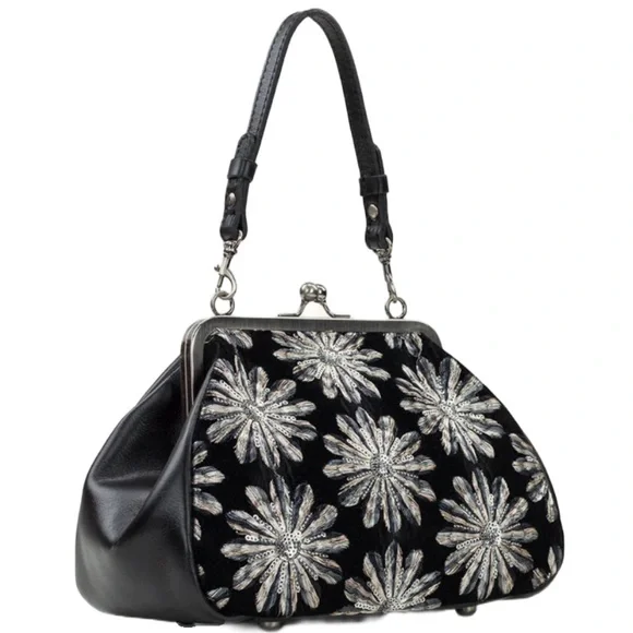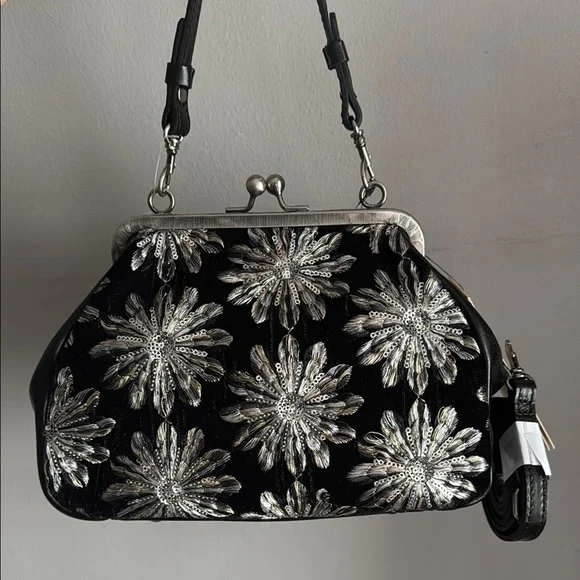 A delightful addition to your collection, the Annie Frame Bag is the perfect blend of dainty elegance and practical functionality, offering a distinctive and stylish look that turns heads. Petite, the Annie is thoughtfully designed to keep your essentials organized, making it as practical as it is beautiful. Effortlessly chic for any occasion, carry it by the handle or or attach the strap for hands-free convenience. The Annie is more than just a bag—it’s a fun, functional, and fabulously unique frame bag. Crafted in gorgeous Metallic Starburst Velvet, you'll make a style statement with this bag.100% polyester, 100% full-grain leather trimInterior: 1 zip pocket, 1 slip pocket; faux suede lining, 100% polyesterExterior: 1 rear slip pocket, deep embossed grape leaf floret logo, protective metal feet, burned edge finishKiss-lock closureSignature brushed metal hardware, heavy handcrafted stitchingDimensions: 10"(W) x 7"(H) x 4 3/4"(D)Strap drop: 22 1/2" - 25 1/2"Handle drop: 6 1/2"Sold out onlineNew with tags and dust bag. Minor snag in embroidery can be seen in second to last photo.