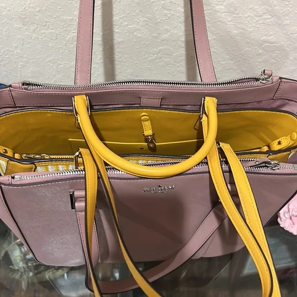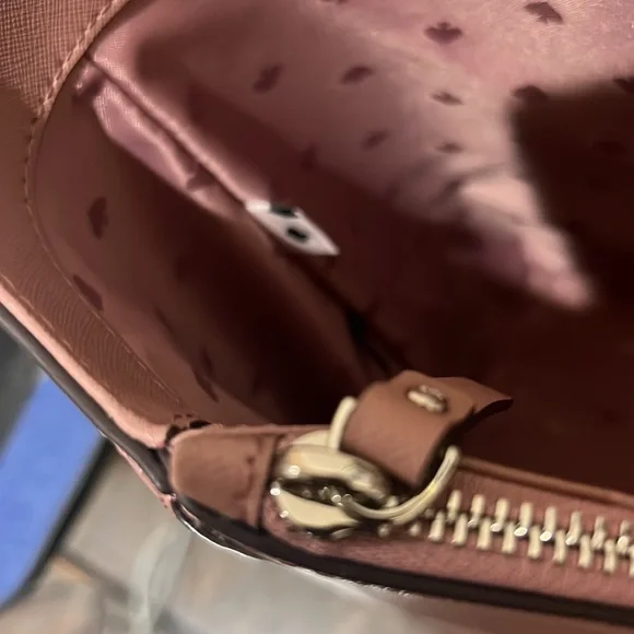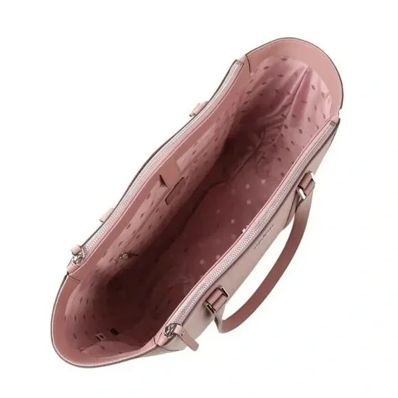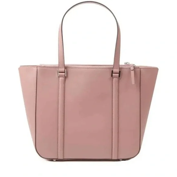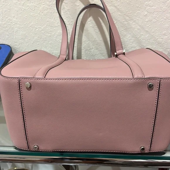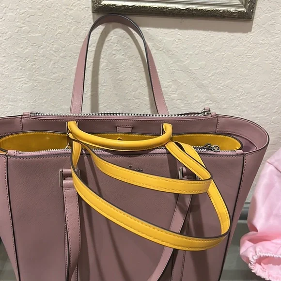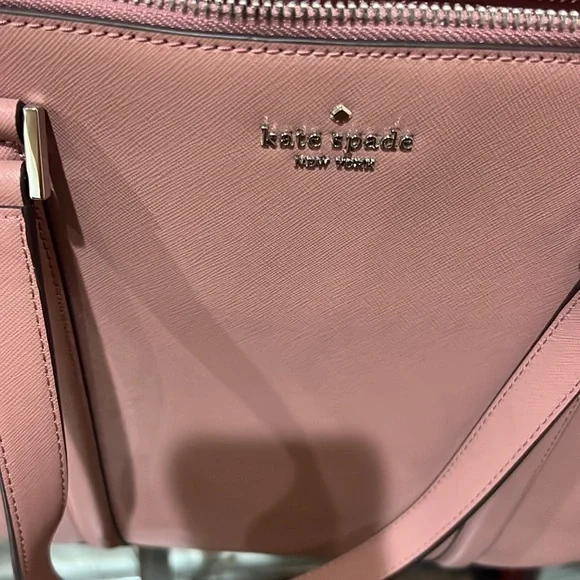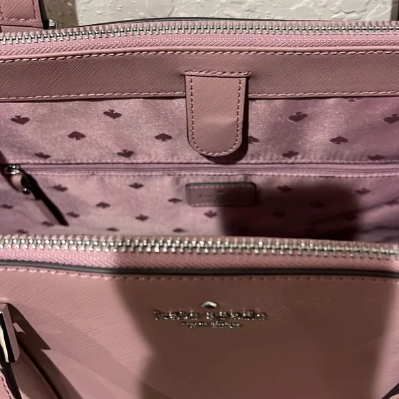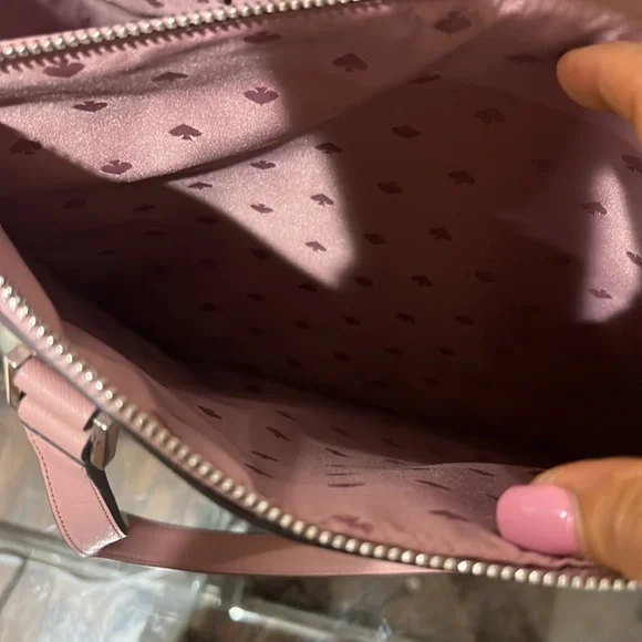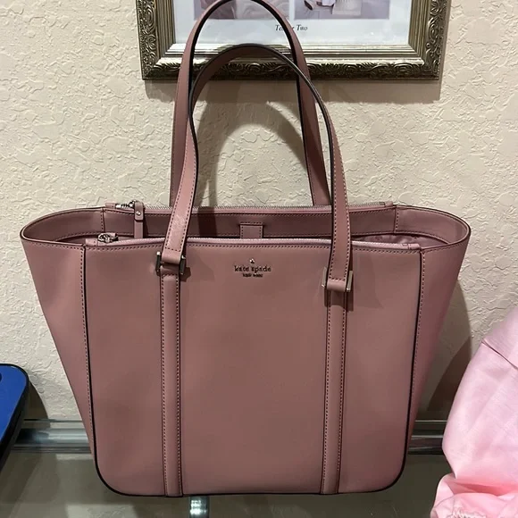 Kate Spade ♠️ Newbury Lane Briar Tote New without tag LARGE sizeLeatherGoldtone hardwareProtective feetOpen topOne interior zip pocket, two slide pocketsHandle drop length: 8"kate spade new york Newbury Lane Briar Tote• Repreve jacquard• Open top with 2 zipper compartments• Gold-tone exterior hardware• Back zip pocket and front slip pocket• 11.6"H X 19.2"W X 6.4'D approximately • ImportedColor rose pink I would say for sure so unique.To demonstrate how large the bag is I put another Kate spate bags inside it . Wow. This purse it’s large