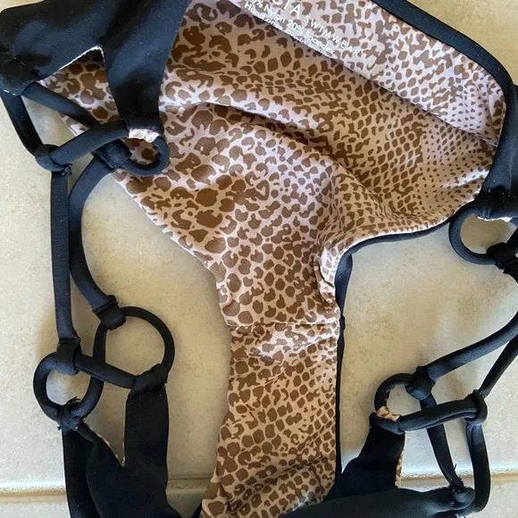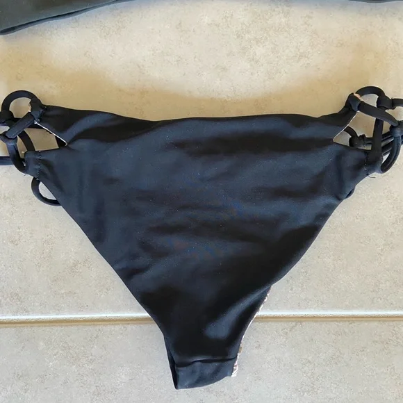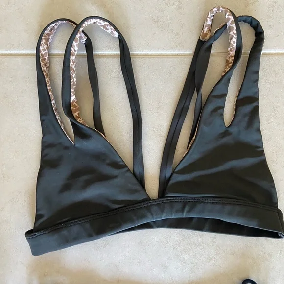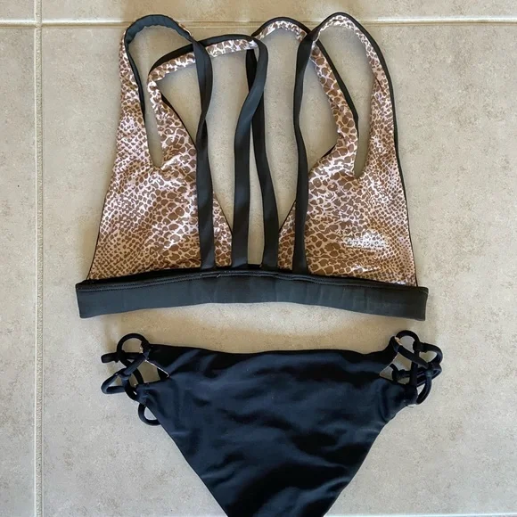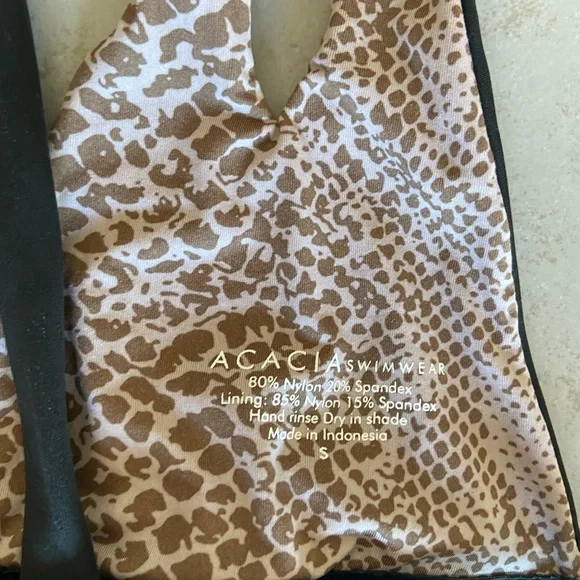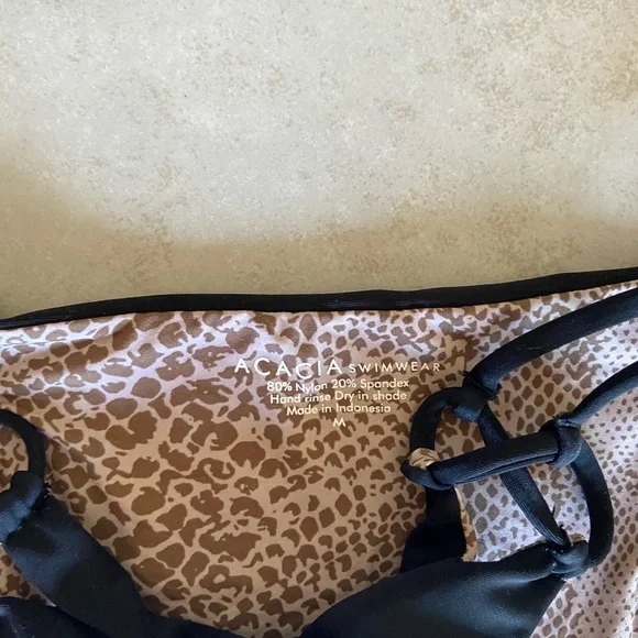 In vguc- no major flaws- few tiny pills but overall great! Small plantation top that runs pretty true to size and not too small in my opinion compared to some acacia- im a 34b and it fits welll, probably not bigger though! Bottoms run tts for acacia so slightly small- im a 4-6 and they fit wel but style is cheeky! The black top and bottoms are slightly different colors - one is probably jet black and the other charcoal but both black!