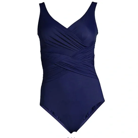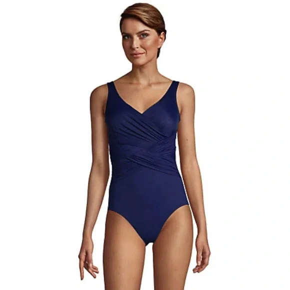 Women's 14 DD-Cup SlenderSuit Tummy Control Chlorine Resistant V-neck Wrap One Piece SwimsuitDeep Sea Navy14DDLYCRA® Xtra Life™ spandex, lasts up to 10 times longer than suits made with ordinary spandexResists breakdown from chlorine, sunscreen, UV rays and sweatUPF 50 sun protection, plus superior stretch and recoveryFirming Slendertex® fabric smooths and shapesGraceful crisscross shirring beautifully shapesSoft cup bra shapes and supportsNylon/spandex. Hand wash. ImportedHow to care for your suitThe Skin Cancer Foundation recommends this fabric as an effective UV protectant only for covered areas.This SlenderSuit® is going to make serious waves.Just look at it! From the breath-taking colors, to the torso-slimming, bust-enhancing, leg-defining cut, it won’t be here long. Like all of our SlenderSuits®, it’s designed to slim and smooth. And thanks to LYCRA® Xtra Life™ spandex, your suit is guaranteed a longer life. This amazing fiber resists breaking down even after repeated contact with every day elements that are hard on your suit - chlorine, sunscreen, even the sun. So your suit lasts longer and retains its gorgeous shape.Brand New WITHOUT tags NEVER Worn Hygenic liner