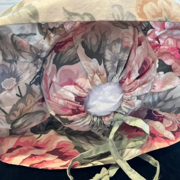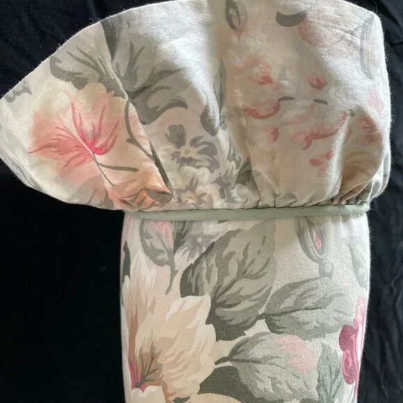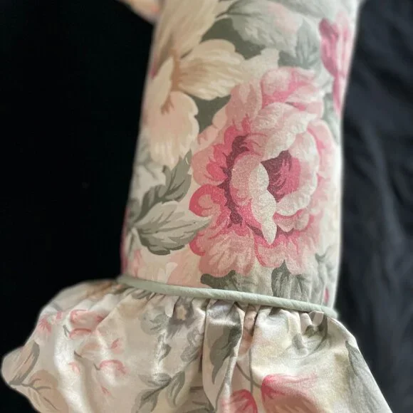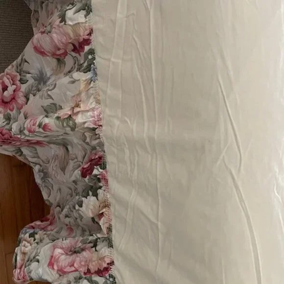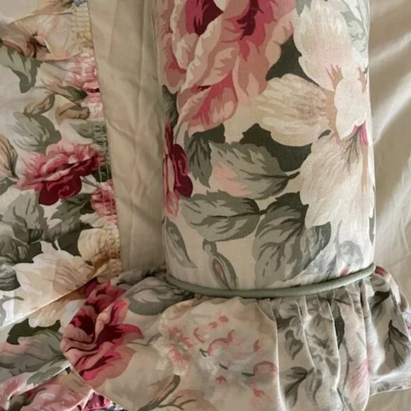 Vintage Croscill Home Fashions twin sized multi-colored bed skirt and matching floral bolster pillow.Made in the USA.50% cotton, 50% poly. Bed skirt is 39" width, 75" length, and 14" drop. Pillow is 16" length, 18" diameter. Both are in excellent condition with two tiny stains on mattress cover section.