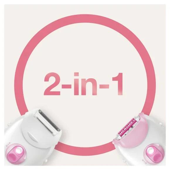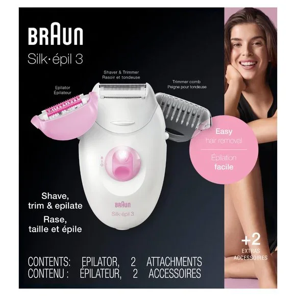 The Silk-epil 3-270 epilator for women is ideal for beginners for long-lasting hair removal. Enjoy weeks of salon-smooth skin thanks to the 20-tweezer system that gently removes hairs by the root. The shaver and trimmer head gives you added options for sensitive areas and with the massage rollers stimulate the epilating area and make the experience less painful. The cord allows you to epilate with no charging breaks, all in one go.Box includes:1 X Epilator1 X Shaver Head1 X Trimmer Head1 X Cl