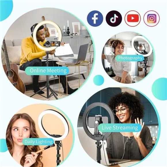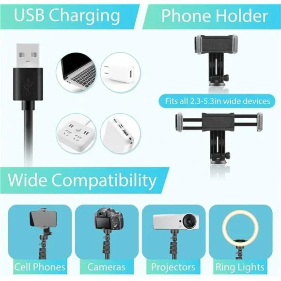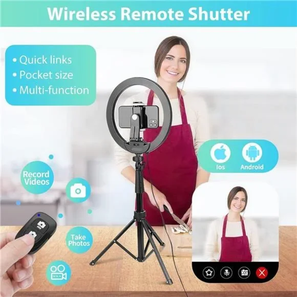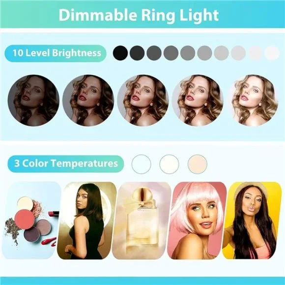 🧿【Ring Light for Various Occasions】 Our selfie-ring light is of 12-inch in size which includes 240 advanced lamp beads of 20W. The adjustable light intensity is powerful enough to meet any requirements of the scenarios such as beauty lighting, vlogging, live streaming, makeup and tutorials, portrait photography and small product photography.🧿【3 Color Temperatures and 10 Levels of Brightness】With more precise cool and warm color temperature settings it allows more flexibility which suits your skin tone and surroundings. There are multiple brightness levels that allows you to adjust the lighting under any environment. Our aim is to produce a continuous, diffused light which flatters different subjects.🧿【62" Phone Tripod Stand】The tripod stand can be easily adjusted to the desired height (range 17 - 62 inch) and flexibly captures tall or short objects. Switch between two modes – either a selfie stick mode or a tripod stand mode as per your preference. The friendly compact design makes it portable for both indoor and outdoor.🧿【180-degree Angle & Wide Compatibility】The tripod head can be rotated up to 180- degrees. The shooting angle can be easily set up within a few seconds. The phone holder can fit all devices in width from 2.3 - 5.3 inch, such as cell phones, cameras, projectors, ring lights. Your device can be placed vertically or horizontally.🧿【Contents】The package includes - 1 x 12-inch ring light, 1 x 62-inch tripod stand, 1 x phone holder, 1 x remote shutter.