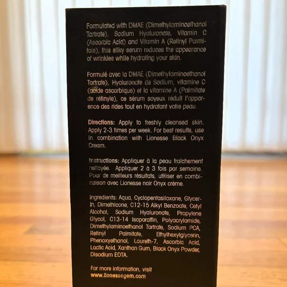 From the Lionesse website: Formulated with DMAE (Dimethylaminoethanol Tartrate), Sodium Hyaluronate, Vitamin C (Ascorbic Acid), and Vitamin A (Retinyl Palmitate), this silky serum reduces the appearance of wrinkles to leave your skin looking smooth and youthful.This item is unopened. Retails for $1000.