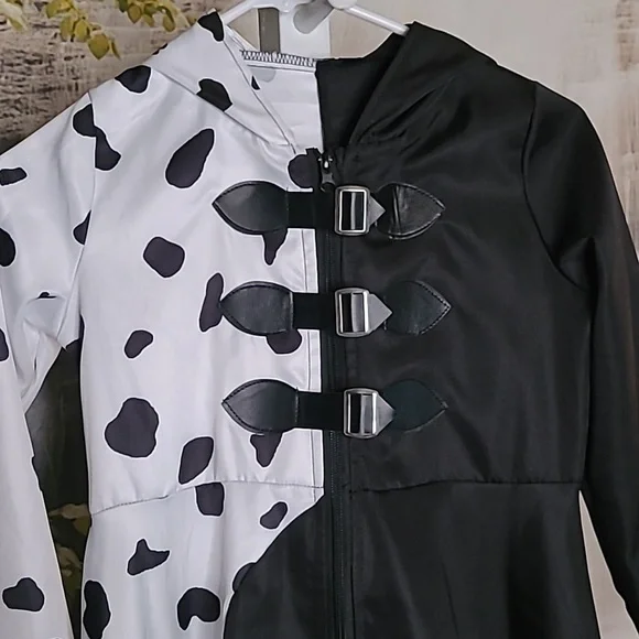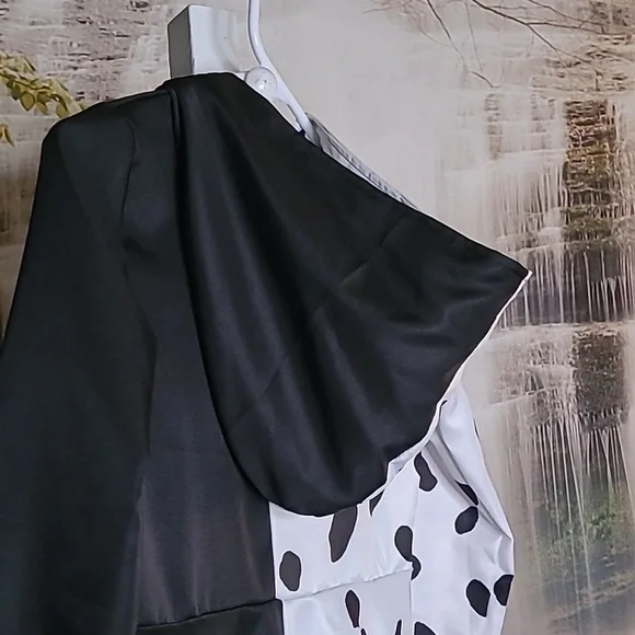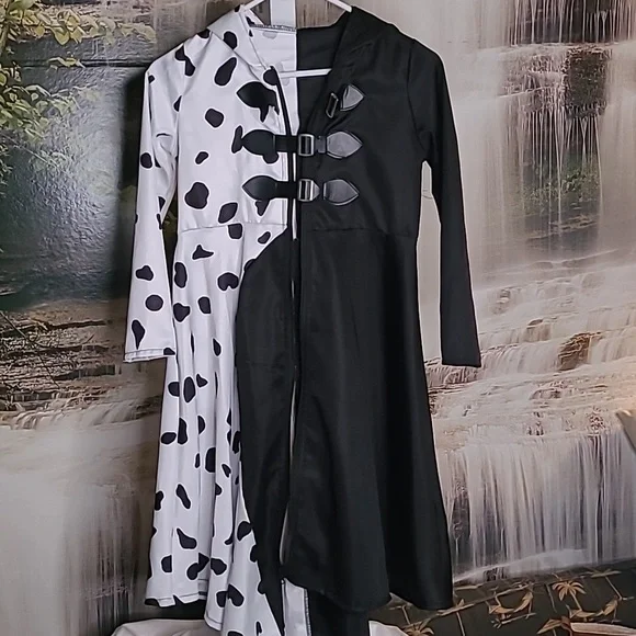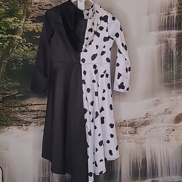 New without tags, never worn! This awesome Cruella De Vil costume long sleeve dress features a full length zipper, buckles across the chest and a hood.It measures 16" across under the armpits, 15" across the waist and 37" in length.Black and white with classic dalmatian spots.Tag is 150.Great for Halloween, costume party, cosplay, theater, dress up.Bundle with some of my other items to save and pay only one shipping!New to ? Use the invite code: NASCARLOVERJEN to receive $10 off your first purchase!101 dalmatians