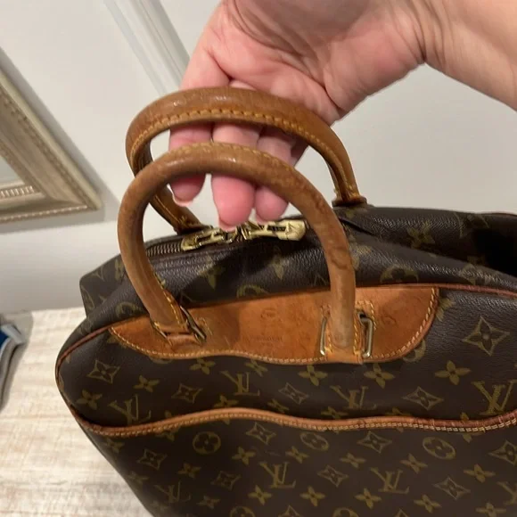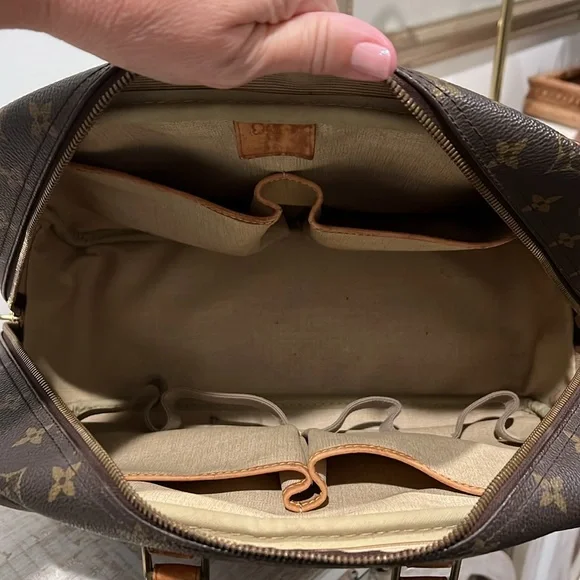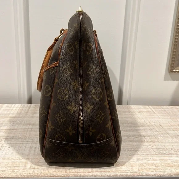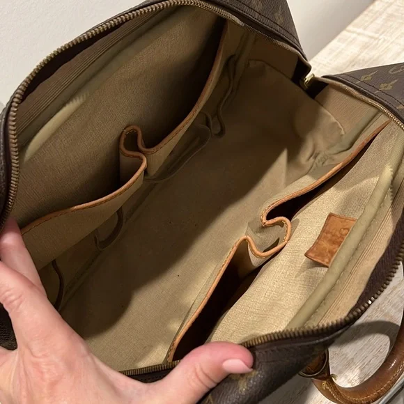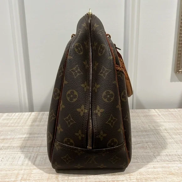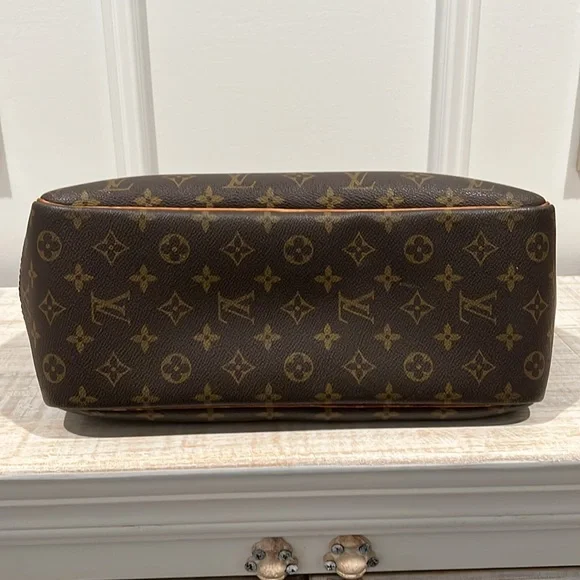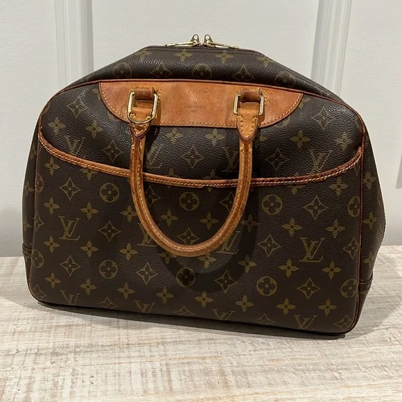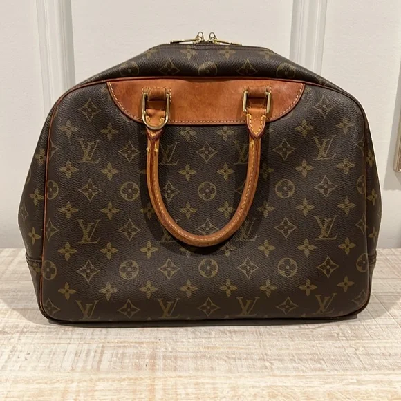 This Louis Vuitton Deauville Handbag showcases a sophisticated monogram pattern on a durable coated canvas. Its structured design is complemented by elegant vachetta leather handles and trim, making it a stylish choice!- Vintage, pre-loved condition (see photos)- exterior: LV monogram coated canvas- approximate dimensions: 13.8 x 12 x 5”- handle drop: 4.7”- large outside pocket- interior is lined with wipeable canvas and includes four large pockets and four elastic band loopsCallouts include darkening and rubbing on vachetta trim and piping. Also, the leather tag with the serial number is difficult to read. Interior is clean, except for a couple small spots. Overall good vintage condition.