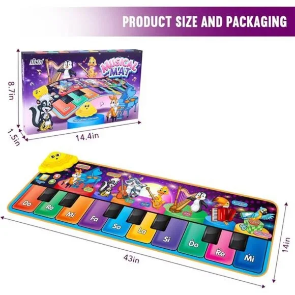🧿Easy to Play:This music toy has 2 modes, the random mode can play 15 melodies, one-click mode has 10 music keys and 7 instrument sounds. you can adjust the volume of music blanket to choose the suitable volume for your kid.The sound of the mat music rewards the baby's liveliness and adds a lot of fun to the baby.🧿25 Music Sounds:The musical mat contains 25 built-in sounds, including 7 instrument sounds,15 melodies and 10 music keys. This music play mat keeps your child fun for hours and also helps kids to gain music knowledge.🧿High quality and safe piano music mat:The piano music mat is made of non-woven fabric, tasteless and non-toxic. High-quality fabrics do not hurt kids' feet and it is easy to clean, but not water washing.🧿Educational Music Toys:The piano music floor mat is colorful and can help children identify different colors and musical instruments and animals. Music can help children develop brains, memory, self-confidence, patience, imagination and temperament. It is an ideal gift for children's birthdays, Christmas and other holidays.🧿Portable Music Mat:The music mat size is 43 x14 In.Foldable to 14.4x1.5 In.Powered by 3 AAA batteries (not included)Whether you are at home or on the go, you can easily use it. Will not be easily damaged by falling, suitable for children over 1 years.