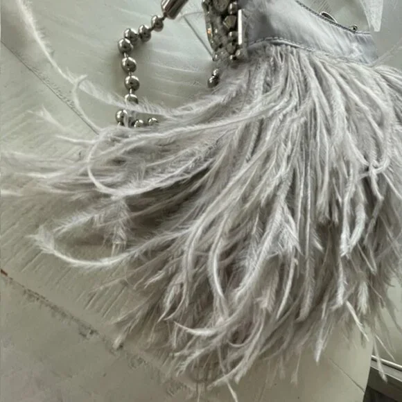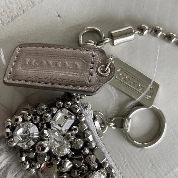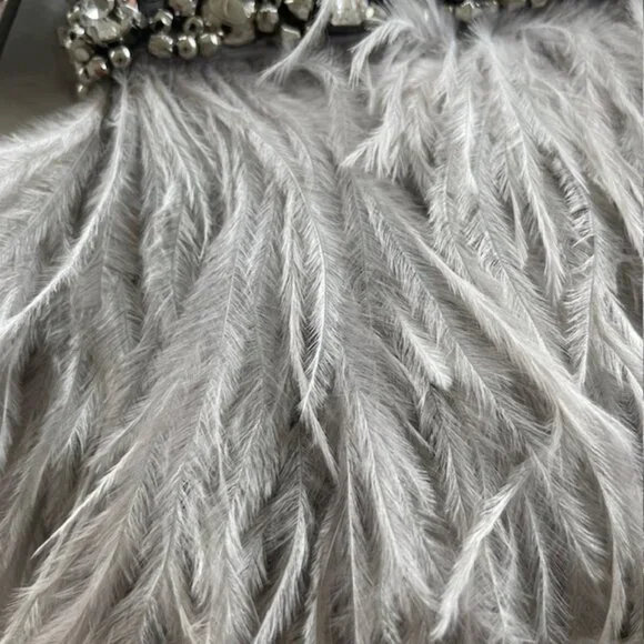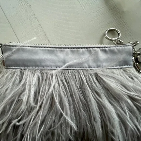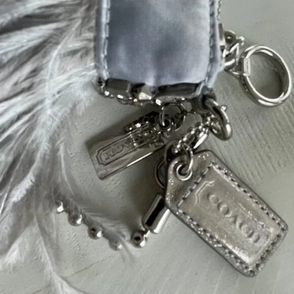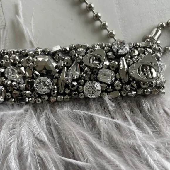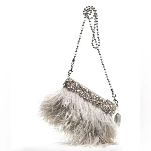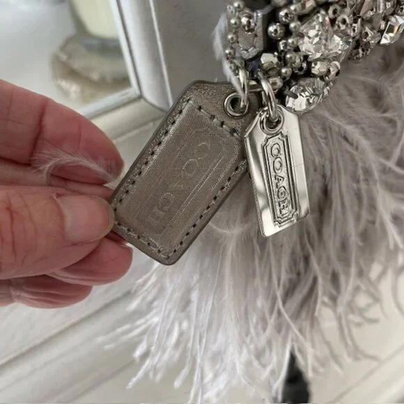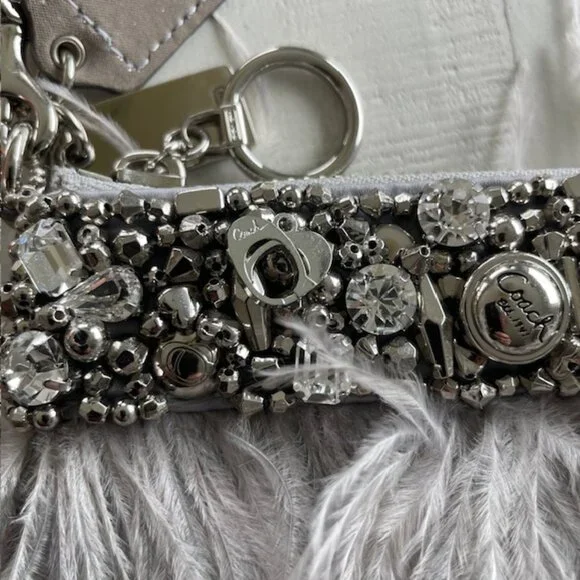 COACHPRE-OWNED - GOOD CONDITIONPOPPYLIMITED EDITIONOSTRICH FEATHER CLUTCH, SHOULDER OR CROSSBODY#18731SILVER/GRAYSILVER AND GEM DECORATIONSILVER BEADED CHAIN STRAP - APPROXIMATELY 34" - DETACHES ON ONE SIDE TO PUT IN BAG AND USED AS A CLUTCHSILVER LEATHER COACH TAGSILVER METAL COACH TAGSILVER FABRIC PURSE UNDER FEATHERSSILVER FABRIC TRIM FABRIC INTERIORSILVER LEATHER PATCH INSIDEZIP CLOSURE WITH SILVER RING