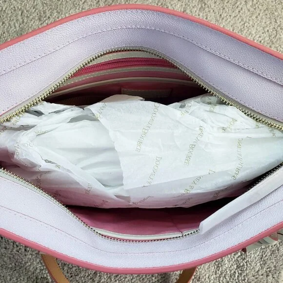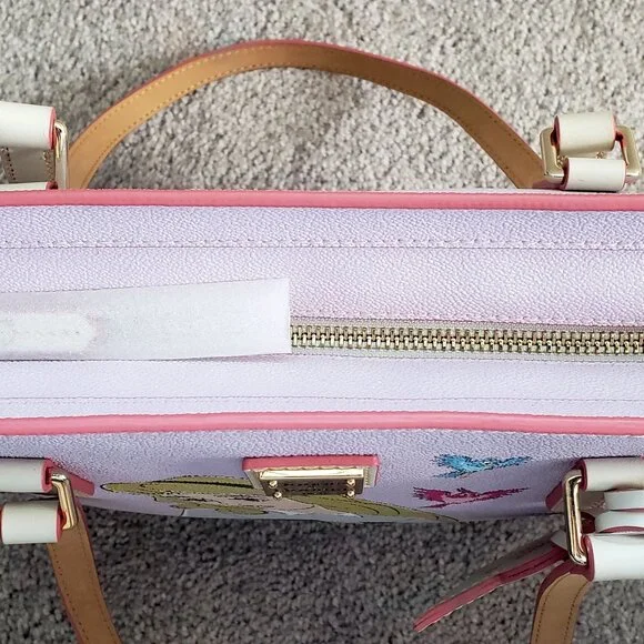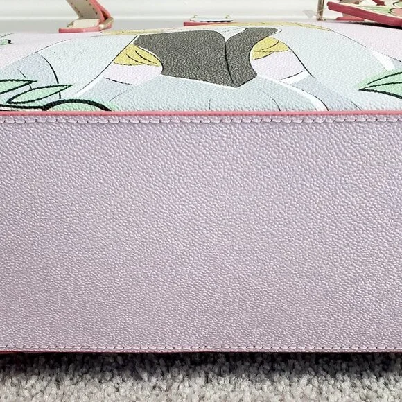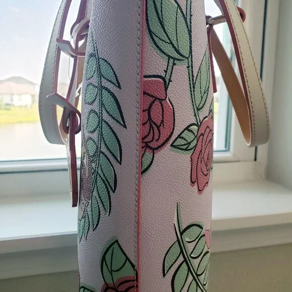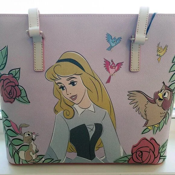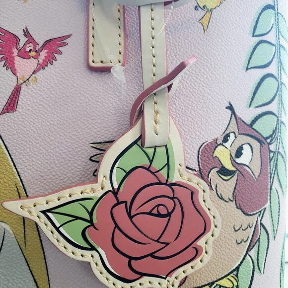 Brand New with Tags, photos shown are exact item you will receive!Screen art on textured coated cottonIncludes Princess Aurora as Briar Rose, owl, birds, and rabbitContrast stitched leather finishingsZip top closure with leather pullInterior zip pocket with leather pullTwo interior slip pocketsInterior cell phone pocketInterior key hookLeather handlesSolid liningFeetGoldtone hardwareDetachable rose leather tag with ''Sleeping Beauty 65th Anniversary'' embossed on back''Dooney & Bourke 1975'' embossed leather label inside''Dooney & Bourke 1975'' embossed metal label on frontCelebrate the 65th Anniversary of Walt Disney's animated classic Sleeping Beauty (1959)Part of the Sleeping Beauty 65th Anniversary Collection by Dooney & BourkeShell: 80% PVC / 20% cottonTrim: 100% cowhide leatherHardware: metalBag: approx. 10'' H x 12'' W x 3 1/2'' DHandle drop: approx. 10 1/2'' LSmoke free home