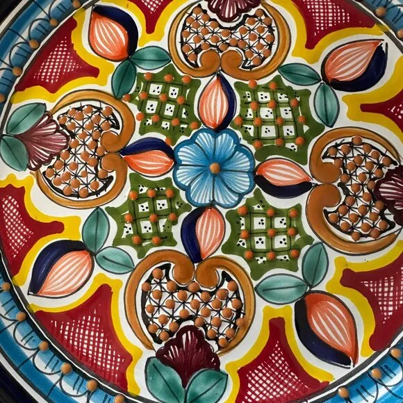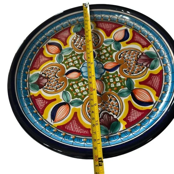 Hand-painted 12-inch Talovera Mexico plate featuring intricate blue floral patterns. Made from lead-free ceramic, this stunning piece adds a touch of traditional Mexican artistry to any home.. Comes from a smoke free home.• Hand-painted Talovera Mexico plate• Intricate blue floral pattern• 12-inch size perfect for serving• Made from high-quality lead-free ceramic• Unisex, suitable for any table settingFeatures:• PlateSize: Unisex 12 inchCondition: Pre-Owned Good
