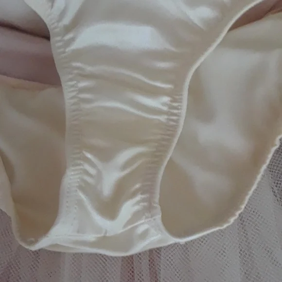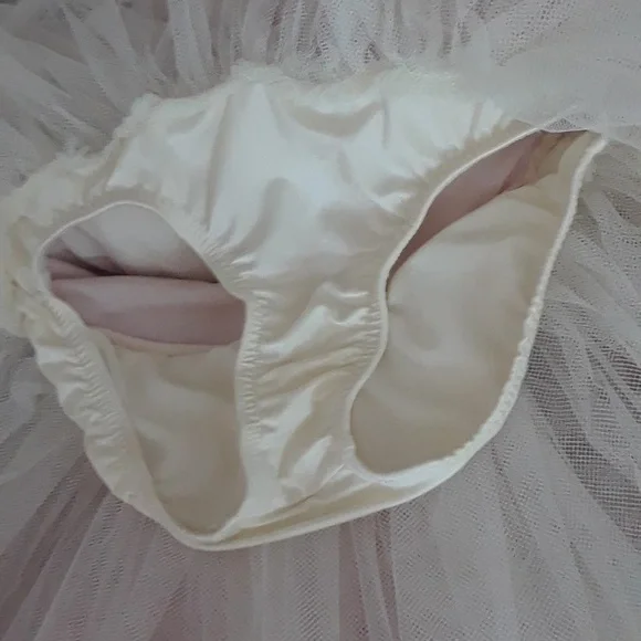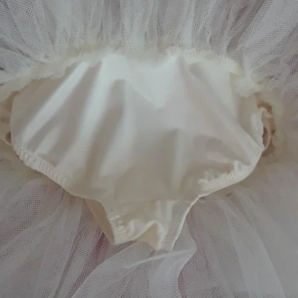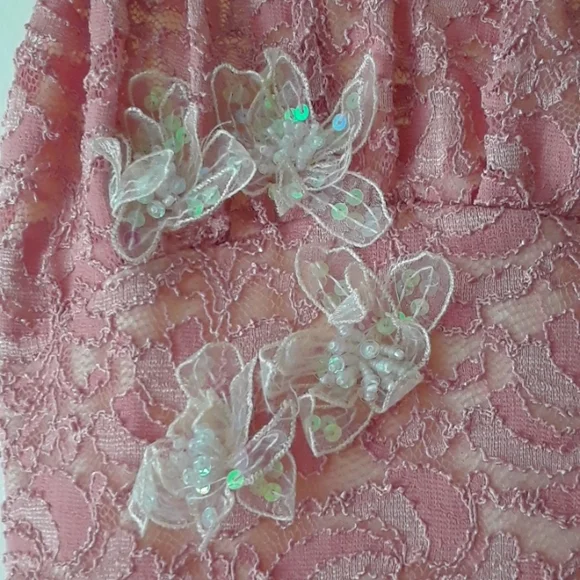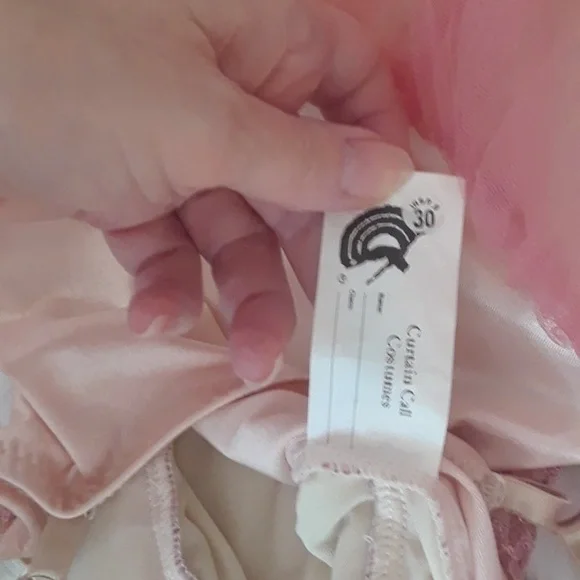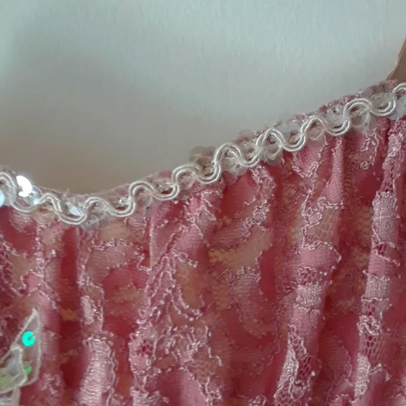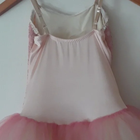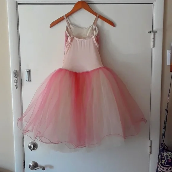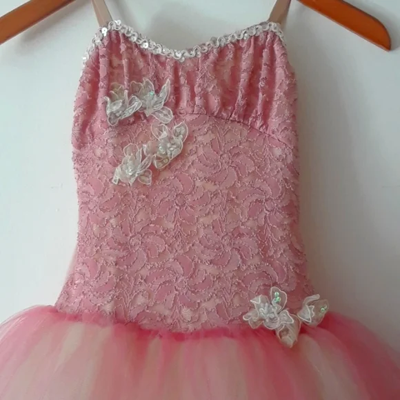Beautiful pink and cream ballet dance dress with rosy pink lace bodice with sequin flowers and neckline trim. Flowers could use some steaming. Very full skirt with pink tulle layer on top and multiple cream layers underneath. I did find one small tear in the bottom layer (see photos).Adjustable straps. Built in panty.