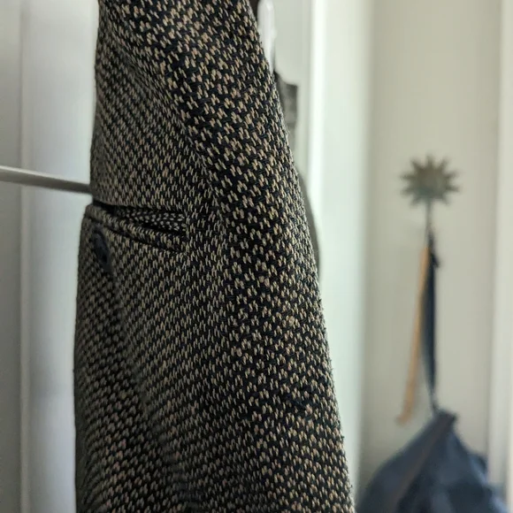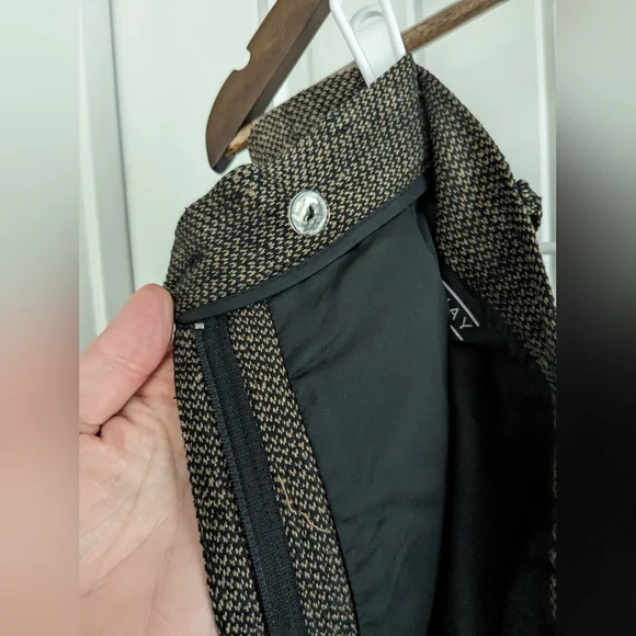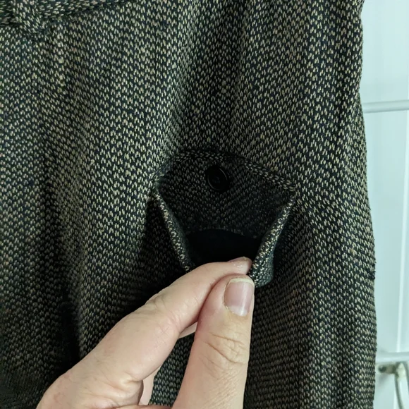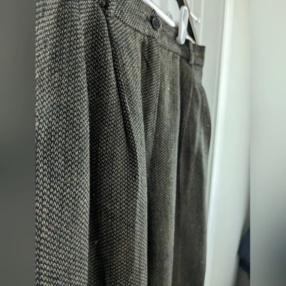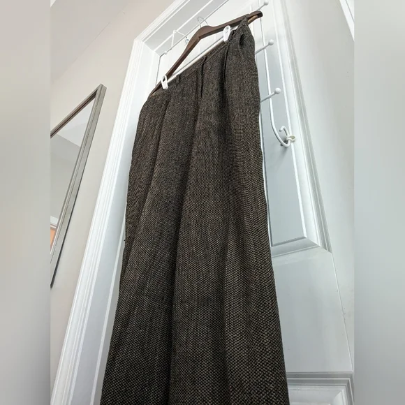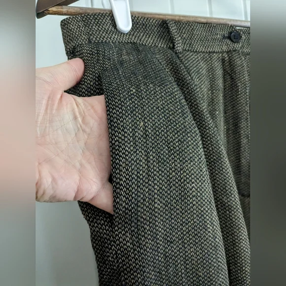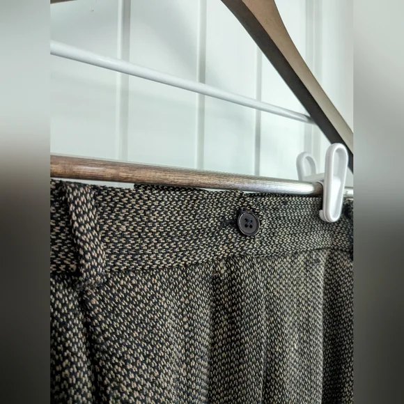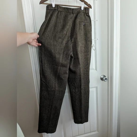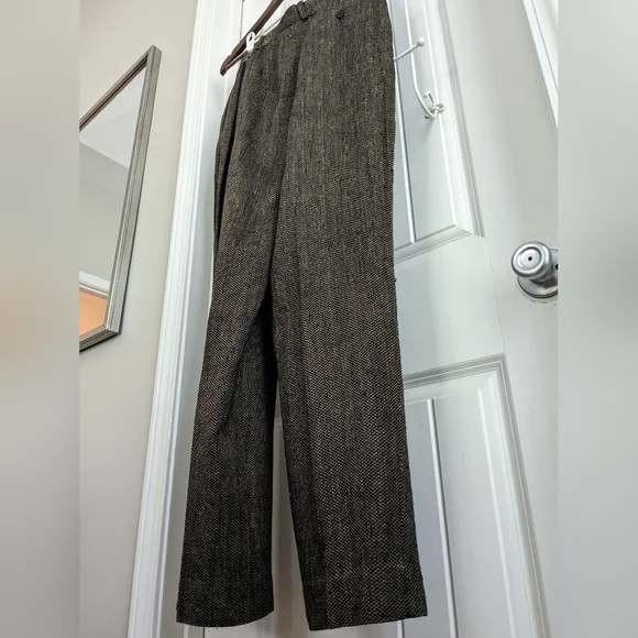 Ann May Boutique Brand 100% Silk Tweed Brown and Black WovenPleated trousers, Dress Pants, Fully lined Dark AcademiaSize 12In good pre-owned condition, normal wear. See pictures for details. No stains or rips, a few small pulls. The inside button is loose and should probably be tightened. Pet-free and smoke-free home.