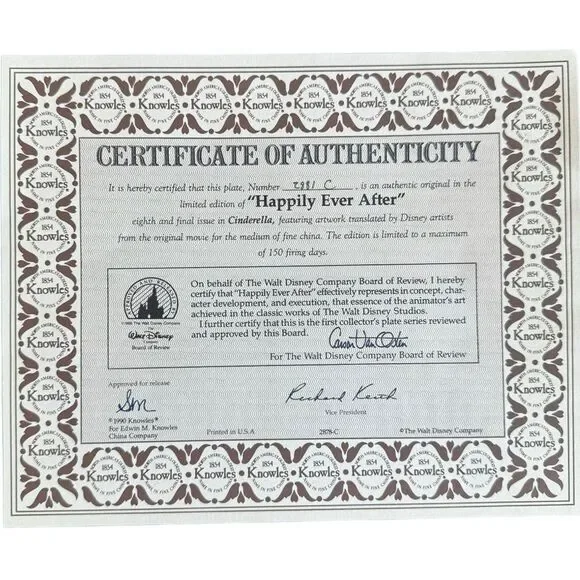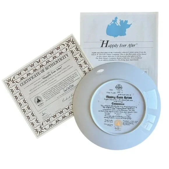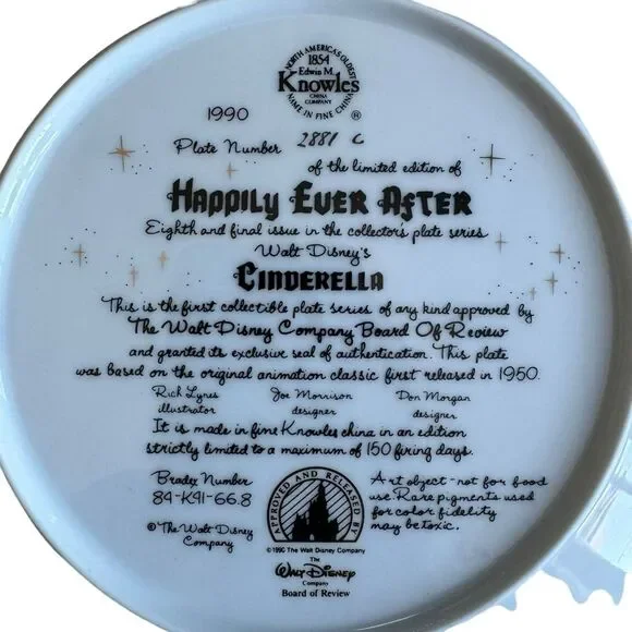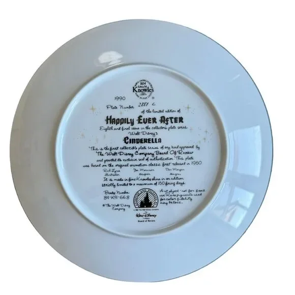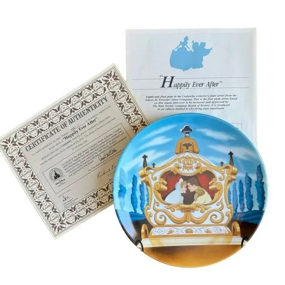 Disney Bradford Exchange Collector Plate Cinderella "Happily ever after"Walt Disney Cinderella 1990 plate number 2881C in the limited edition of happily ever afterfirst issue in a limited edition, collectors plate series based on Disney’s classic film, Cinderella. This plate collection is a tribute to the original animation classic and it is approved by the Walt Disney Company Board of review.crafted on fine Knowles, China, in an edition strictly limited to a maximum of 150 firing days not for food use. comes in original box . New And only opened to view plate.other plates are available. Please check mycloset for more information.