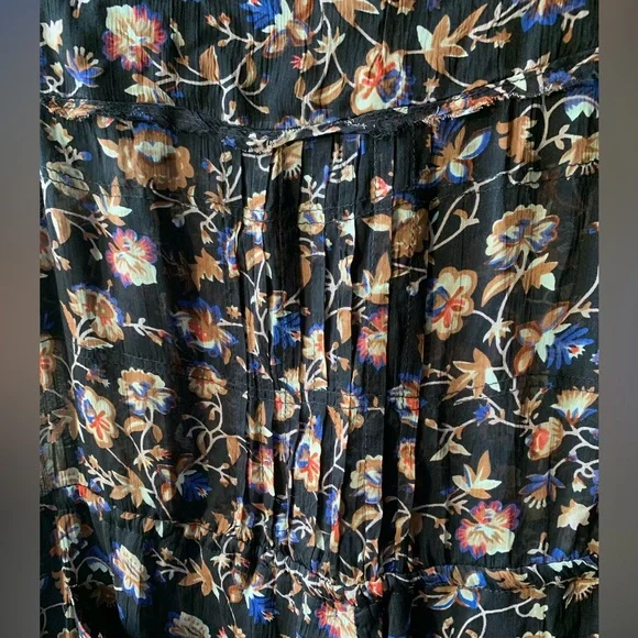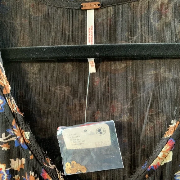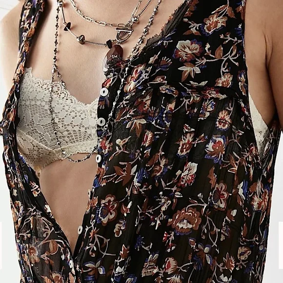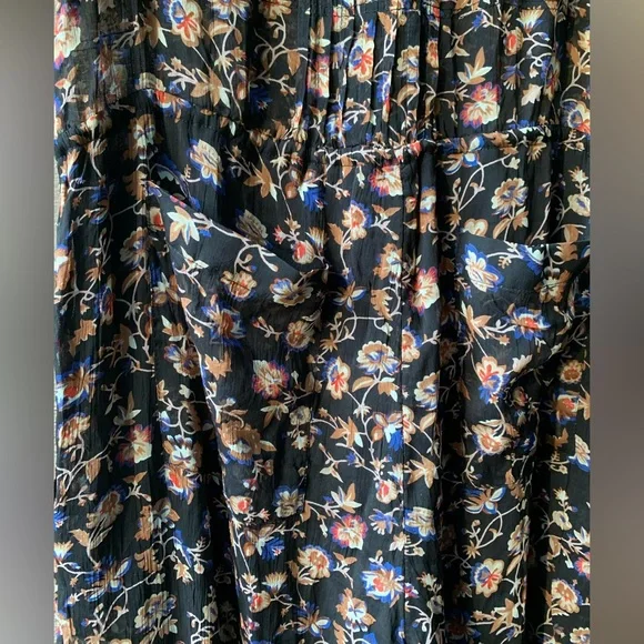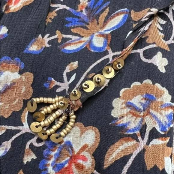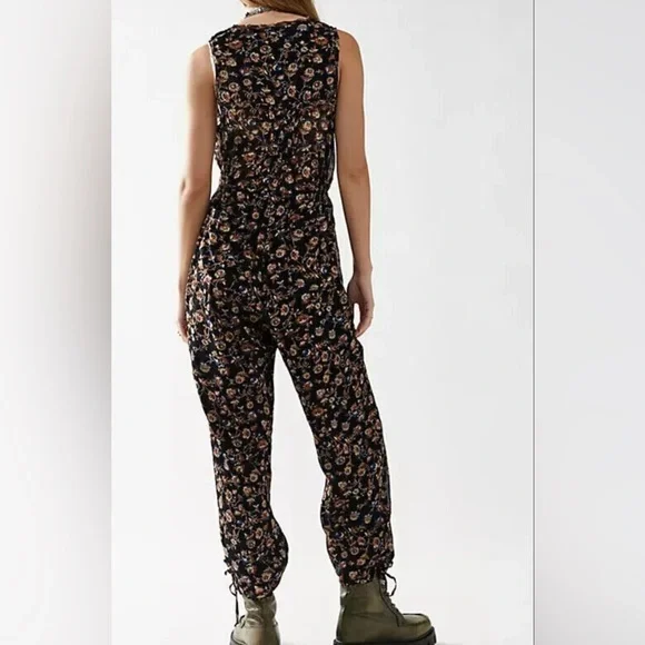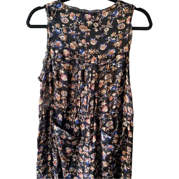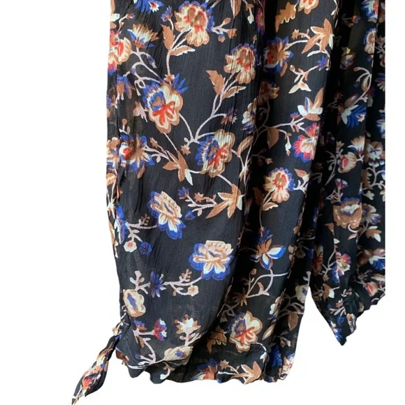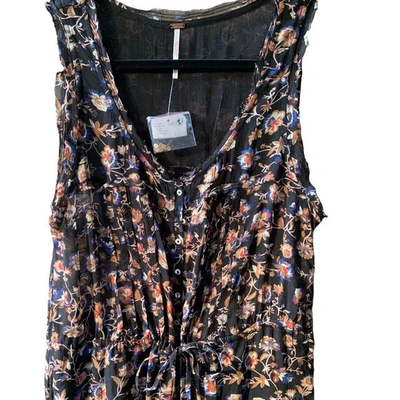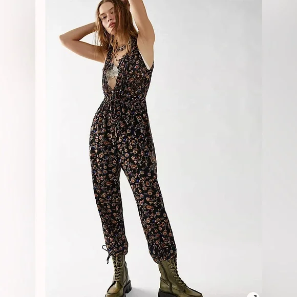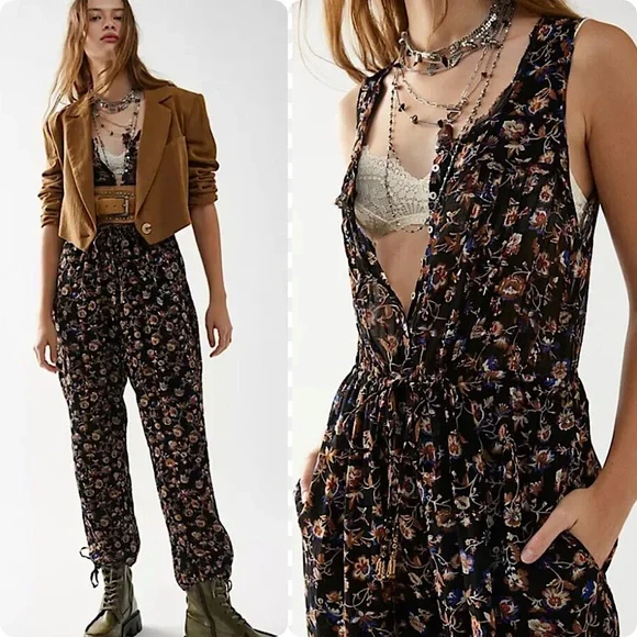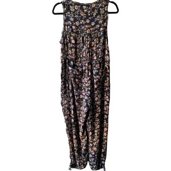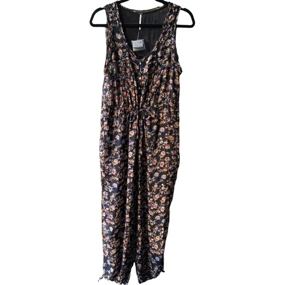Free People Samara Jumpsuit in Midnight Combo, black with a tan, white, red, and blue floral print. Printed to perfection, this super versatile jumpsuit is featured in a sleeveless, cinched-leg silhouette with button-front neckline for added versatility. Fit: Classic, relaxed fit. Features: Adjustable waist detail, side pockets, dropped armholes, button-front neckline. Why We <3 It: Just as versatile as it is vintage-inspired, this ready-for-anything jumpsuit is the perfect done-in-one piece for any occasion. Adjustable waist with sequin detailed ties, adjustable hem with self ties. Button front, sheer tank with fully lined pants. Back patch pockets. 100% Viscose. Pit to pit 17", rise 13", inseam 25". Size XS. New with tags.