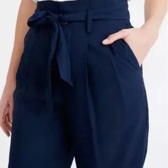 Madewell Drapey Wide Leg Paperbag High-Rise Pants in Navy BlueCrafted from luxe satin-backed crepe, these tapered pants are the ultimate warm-weather style. The pleated paper-bag waist is made to pair with a tucked-in tee or tank.Sit above hip, fitted through hip with a slim leg.Style# L0375100% poly.Machine wash.Size 6New with tagsRun a bit big IMO. Approximate measurements:waist: 30"rise: 12"inseam: 26"See: https://www.madewell.com/drapey-paperbag-pants-L0375.html