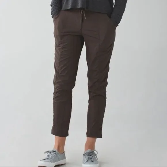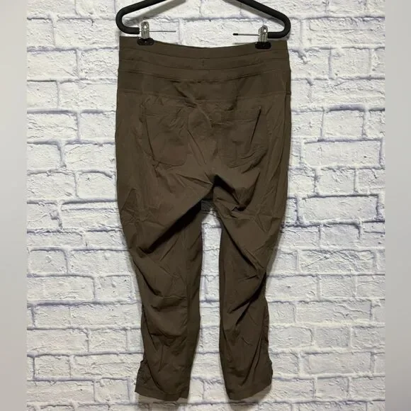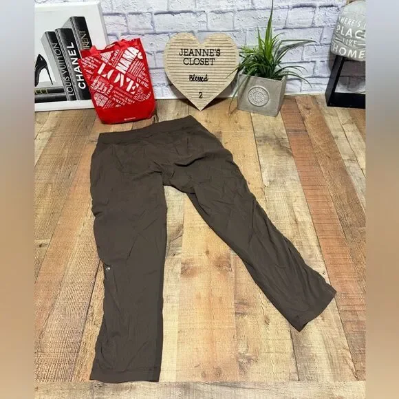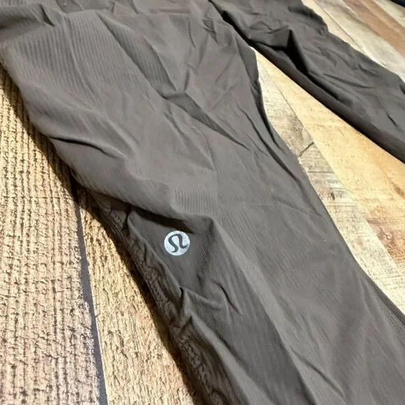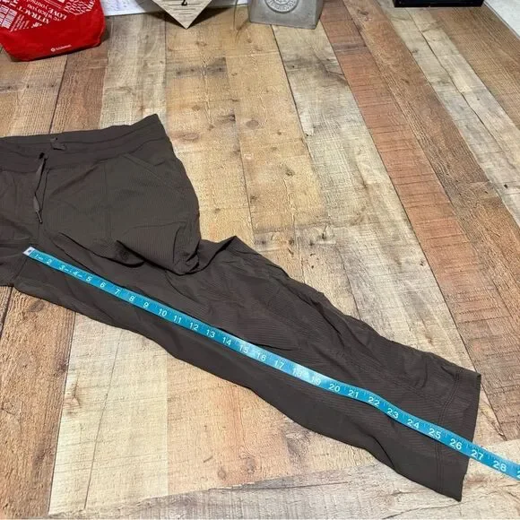 Lululemon street to studio brown striped ribbed dance studio pants size 10 Pre owned good condition with minor signs of wear - the size dit in pockets is worn off, also the logo on outer back leg has wear (from one direction it looks ok but up close from another direction has wear shown in photos) No holes or stains Elastic waistband and drawstring Side and back pockets Tapered legs