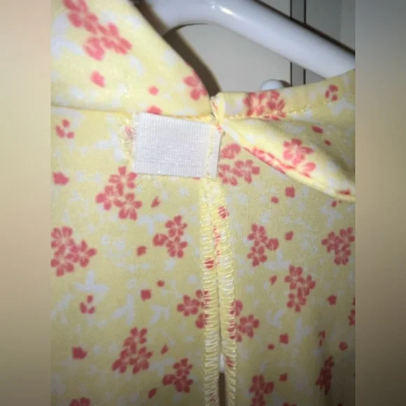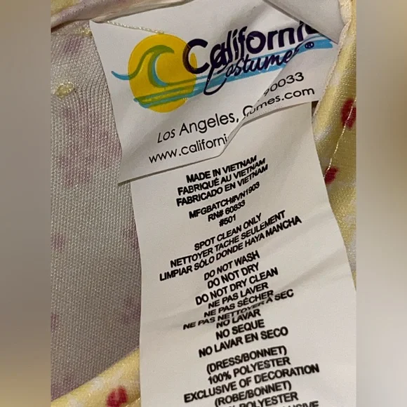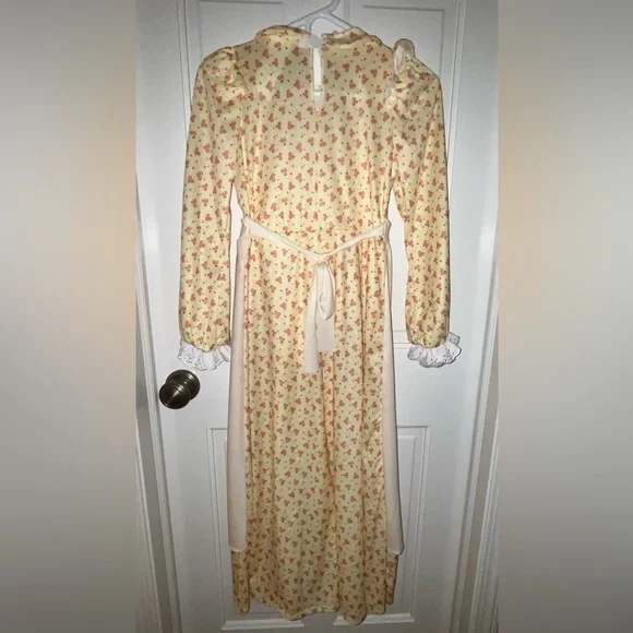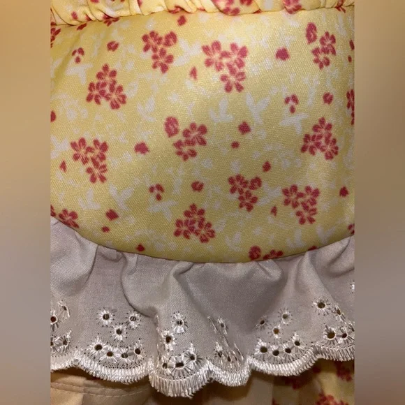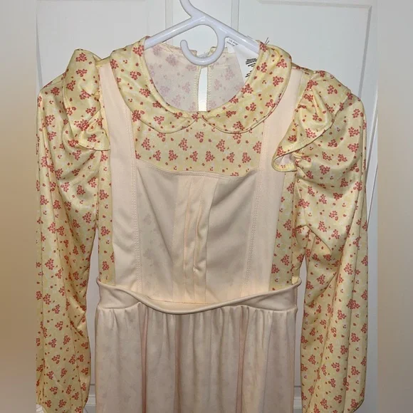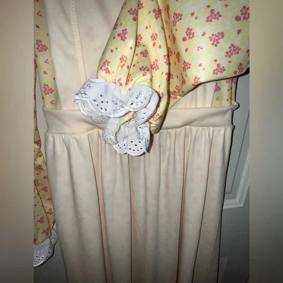 KIDS PIONEER COSTUME SIZE LARGE IN YELLOW WITH BONNET AND ATTACHED APRON in excellent condition and ready for your youngster’s Pioneer Day or Halloween. Dress is 46” in length and 13” pit to pit. Dress is yellow with red floral bunches. Apron is in a lighter yellow and is attached. Bonnet has ribbon closure and lace trim that matches the dress cuffs. Dress is over the head and has Velcro closure at back of neck.