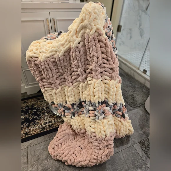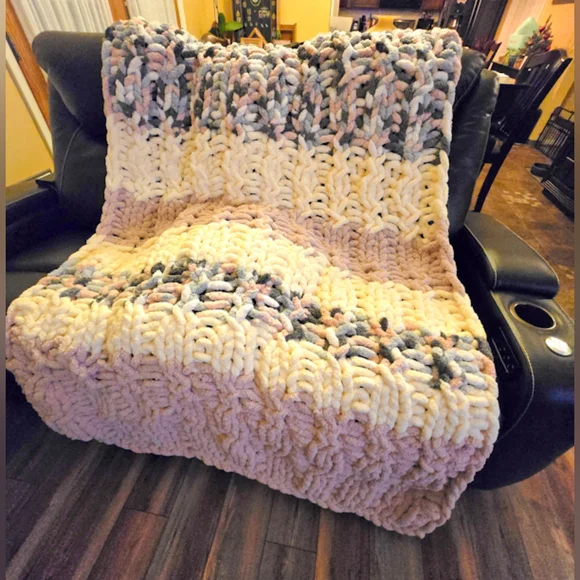 Cozy chunky cable knit blanket. Features soft pinks and creams with a variegated soft pink yarn. Perfect for adding warmth and style. Perfect for wrapping up or dispaying in your home. Machine washand tumble dry on delicate. Measures 45"W×98L. Great for across the foot of a king bed and more!