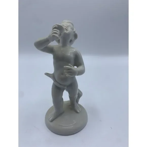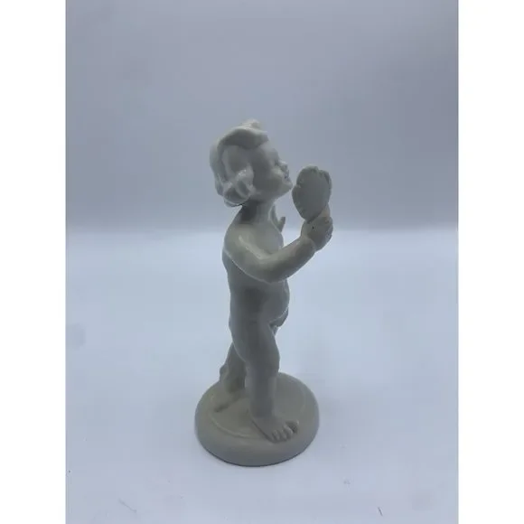 Delve into the timeless beauty with these vintage German porcelain cherub figurines. The set includes two exquisitely crafted pieces, each measuring 5.5 inches in length. One cherub is captivated with a mirror, while the other is adorned with a wine glass, each piece bringing a touch of ethereal charm to any setting.Crafted with the utmost attention to detail, these figurines boast a classic white hue that highlights the delicate features and intricate design synonymous with high-quality porcelain. Whether displayed on a mantel or nestled on a shelf, these cherubs are sure to grace any space with their serene presence, suitable for all occasions.LocationGW Red Q 4AJ