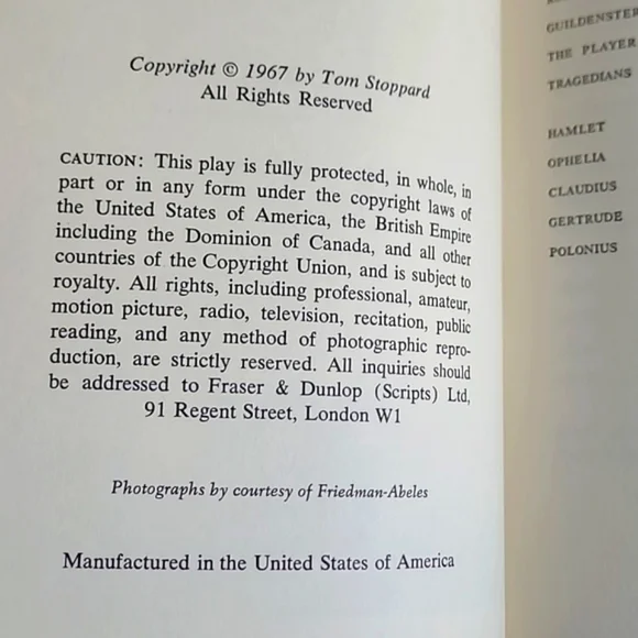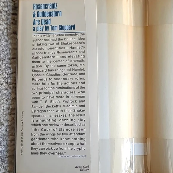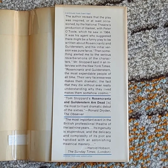 Vintage Hardcover BookRosencrantz & Guildenstern Are Dead a Play by Tom Stoppard1967 Edition. Excellent condition.Rosencrantz and Guildenstern Are Dead is one of the most enduring and frequently performed plays of contemporary theater and has firmly established itself in the dramatic canon. Acclaimed as a modern masterpiece, it is the fabulously inventive tale of Hamlet as told from the worm’s-eye view of the bewildered Rosencrantz and Guildenstern, two minor characters in Shakespeare’s play. In Tom Stoppard’s best-known work, this Shakespearean Laurel and Hardy finally get a chance to take the lead role, but do so in a world where echoes of Waiting for Godot resound, where reality and illusion intermix, and where fate leads our two heroes to a tragic but inevitable end.#Tony Award, Benedict Cumberbatch, Daniel Radcliff, Gary Oldman, Tim Roth,