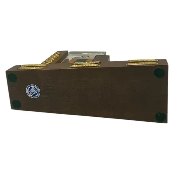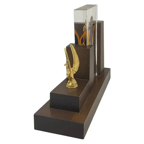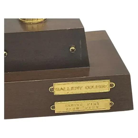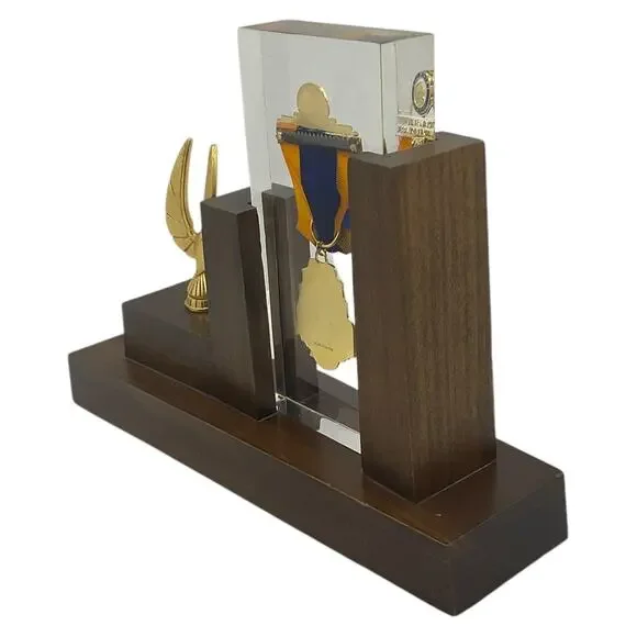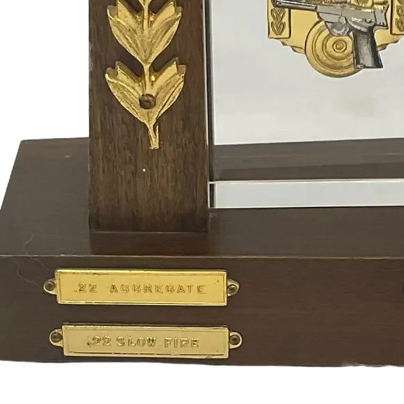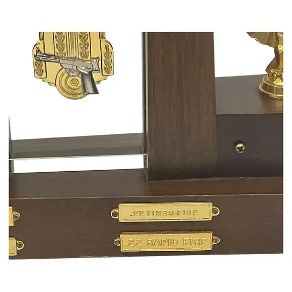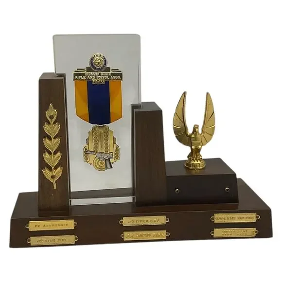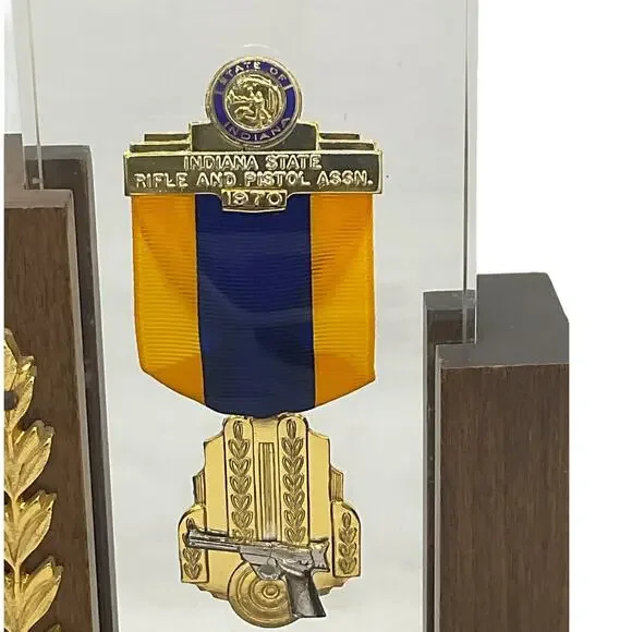 Vintage 1970 Indiana State Rifle and Pistol Association award trophy featuring a medal mounted on acrylic and wood with a gold-tone pistol design. Made by Blackinton, this mid-century shooting competition award includes engraved plaques for various .22 and centerfire categories. A collectible piece of firearm sports history, perfect for display by gun enthusiasts, vintage trophy collectors, or shooting sports fans.Event Year: 1970Association: Indiana State Rifle and Pistol AssnMaker: BlackintonMaterial: Wood, acrylic, metalDesign: Mounted medal, gold-tone eagle, engraved event plaquesAward Categories: .22 Aggregate, .22 Slow Fire, .22 Timed Fire, .22 Rapid Fire, Gallery Course, Center Fire Slow FireStyle: Mid-centuryColor Scheme: Brown, gold, blue, orangeApproximate Dimensions:8" W x 6.25" H x 2.88" DCondition:Very good vintage condition with minor wear consistent with age. Please see photos for details and condition.