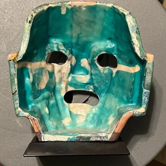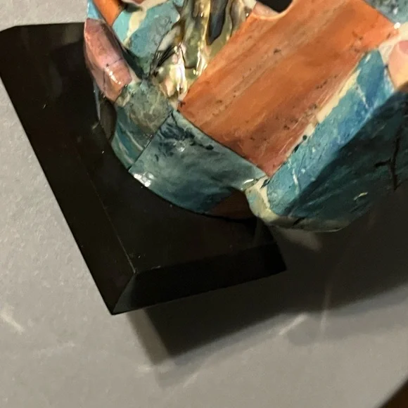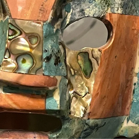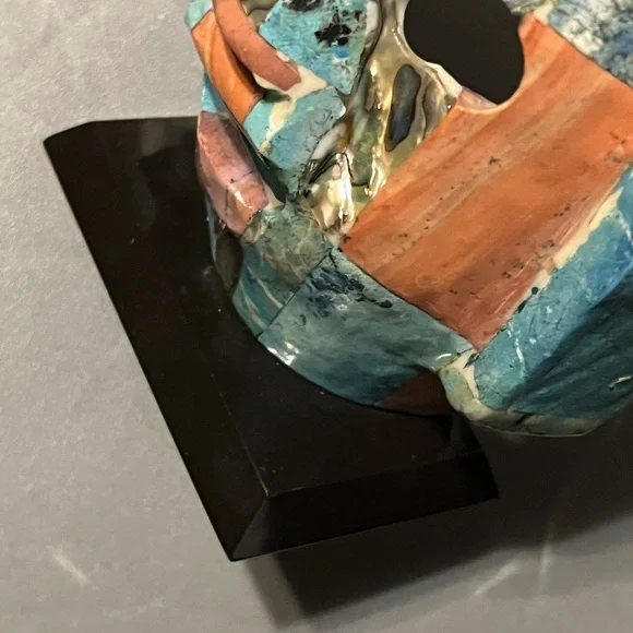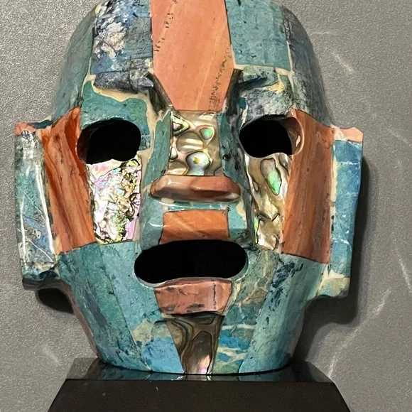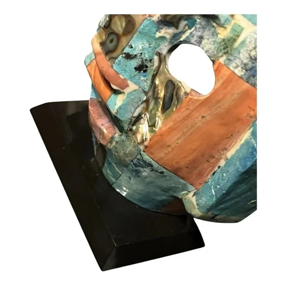 Add a touch of artistic primitive flair to your space with this multicolor mosaic Mayan death mask decor. Featuring a blend of abalone and other precious stones stands on a wood base. This piece is perfect for enhancing any room's aesthetic. Stands 6” high. Good preowned condition.#Tribal #Unique #PreciousStones #Mask #Mayan #Primitive