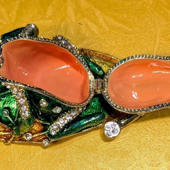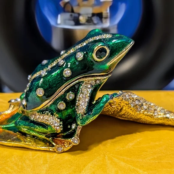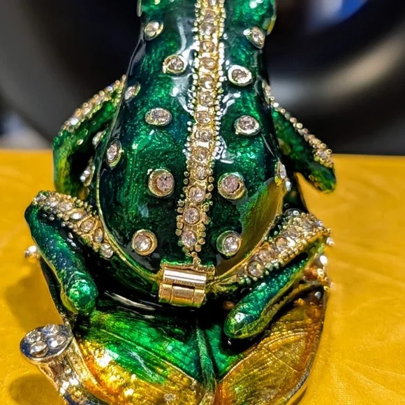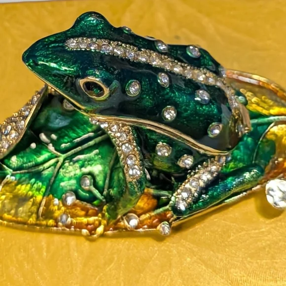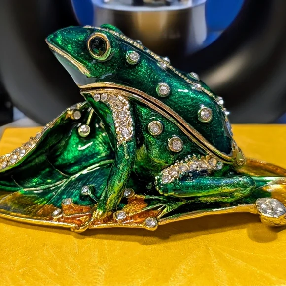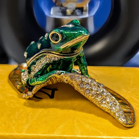 NIB- from @dillpicky mystery boxs. Elegant brass and crystal green frog on a golden leaf that looks like a beautiful statue, yet can hold jewelry or any other types of keepsakes you may have.The dovesmeasure 4"$w x 2.5"hx 2"d. White crystals adorn this beautiful keepsake 🔥 Sharing the love with my posh friends and followers 💜