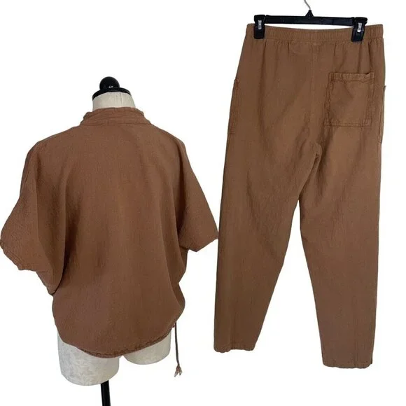 Cotton Palms Vintage Womens Pant Top Set Size Small Brown Drawstring WaistSize: Womens SPlease check measurements with a comparable item to confirm fit!Pants waist across unstretched 14 inPants hips across 20 inPant rise to top of waist band 13.75 inPant inseam 30 inPant leg opening at bottom 7.5 inTop length 23 inTop arm pit to arm pit 31 inFeatures:BrownPant Have Front Pockets and Back PocketTop has Oversized FitTop has Drawstring WaistPants have Pockets and Elasticized Drawstring WaistCasual100% CottonMade In USACondition: Pre-Owned Excellent preowned condition