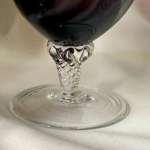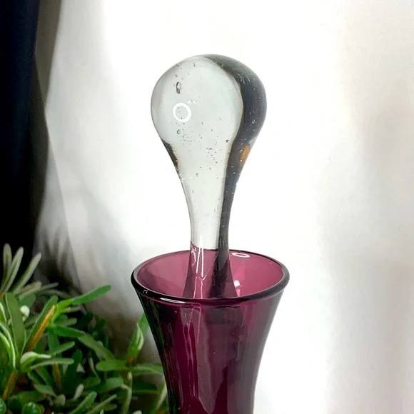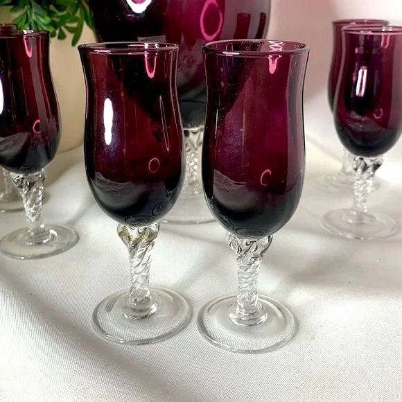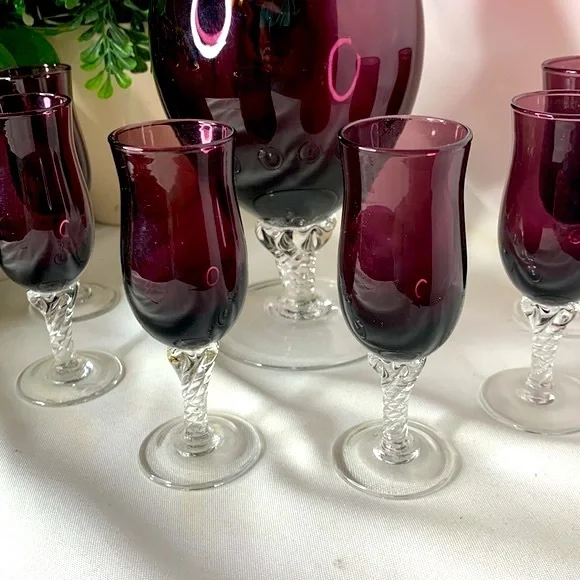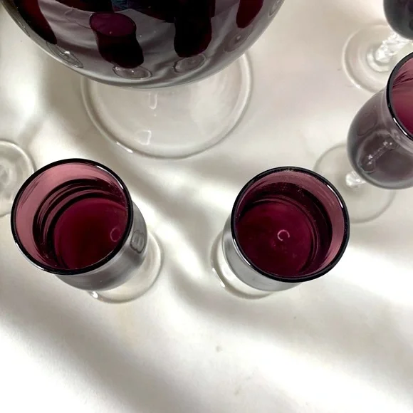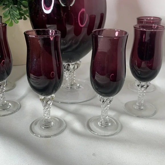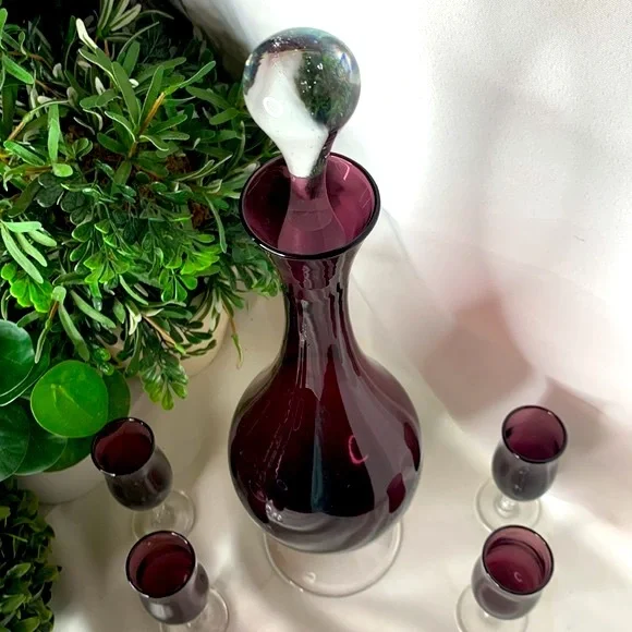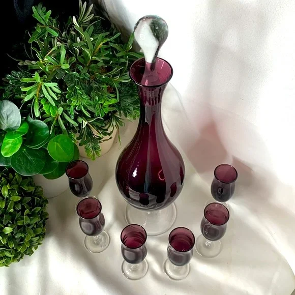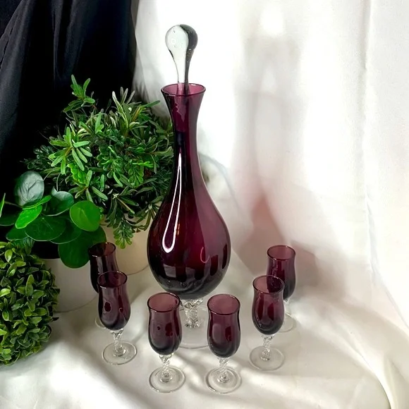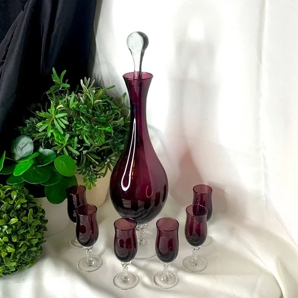 MCM Italian Empoli amethyst decanter with 6 cordials glasses.Decanter is 16” tall with stopper x 4” wide, cordials are 4 1/2 inches tall x 1 3/8 inches wide at the rim and hold approximately 2oz liquid.Cordials are in excellent condition. No chips or cracks noted, decanter is very good but has one small flea biteon rim (see picture). Beautiful set!Thanks for looking! 😊Unable to bundleM35-BL2-Rkd