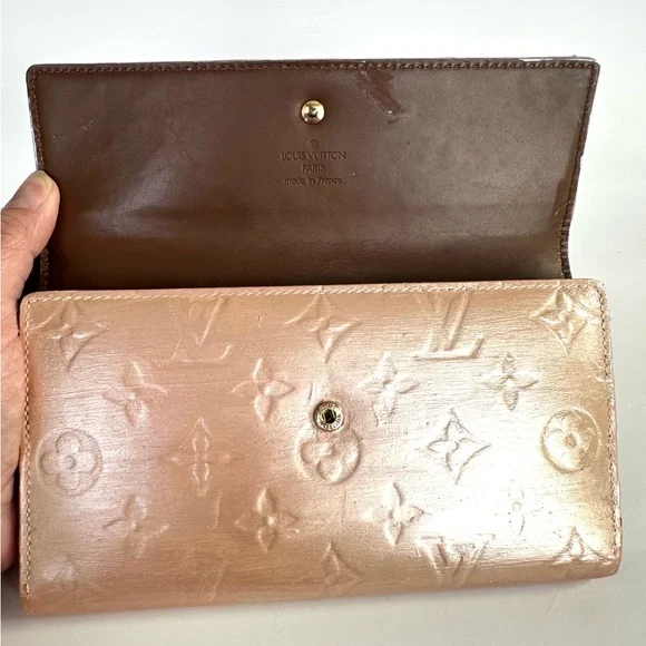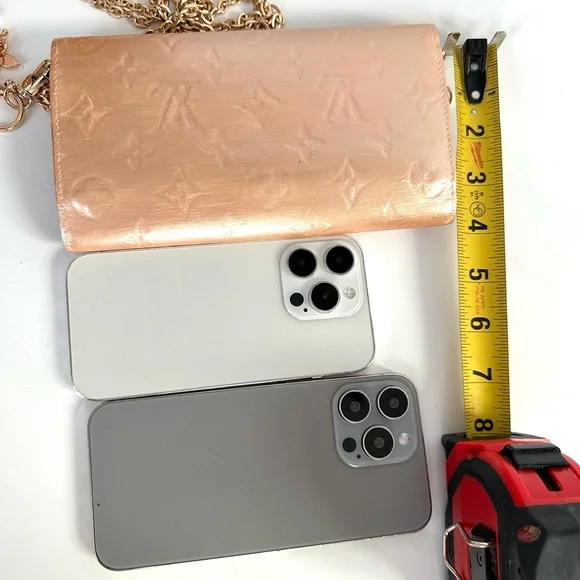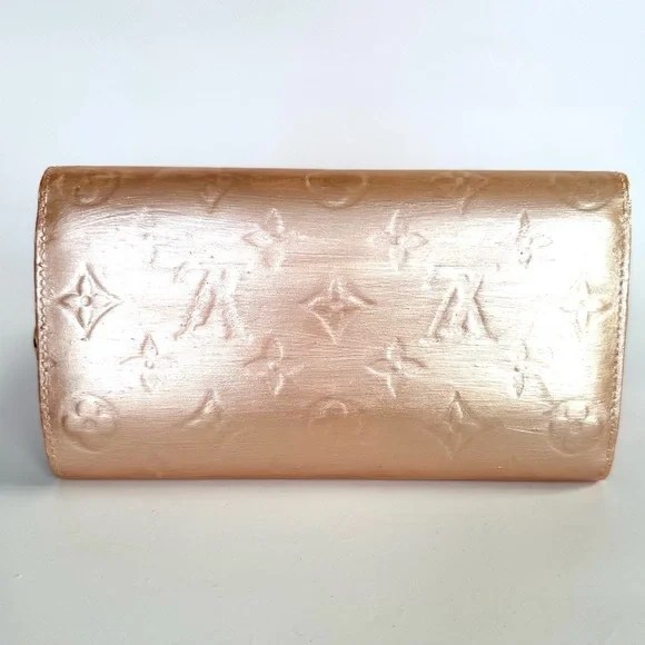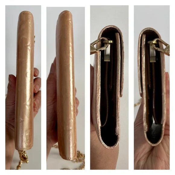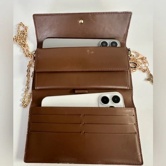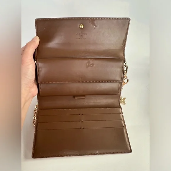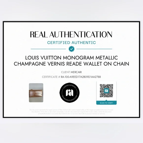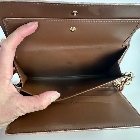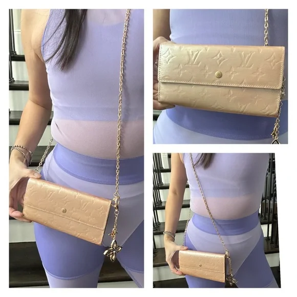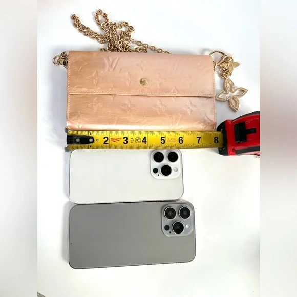 This is a preloved *verified* authentic LOUIS VUITTON Monogram Metallic Champagne Vernis Reade Wallet on Chain paired with offmarket chain & charm. Authentication certificate included. Serial # & logo in pics. Exterior leather dyed and sealed with protectant, artistic impressions present and at certain angles may appear streaky. All working hardware (buttons, zippers). Other minor imperfections exist (ie scratches, discolorations, bends, cracks, fading, flaking, ons, bends, cracks, fading, flaking, tears) - minor tarnish & scratches on hardware, minor coin stains in coin pouch. Fits iPhone 15 pro & 15 pro max!! Comes with non-LV bag and box. Nonsmoking & pet-free home