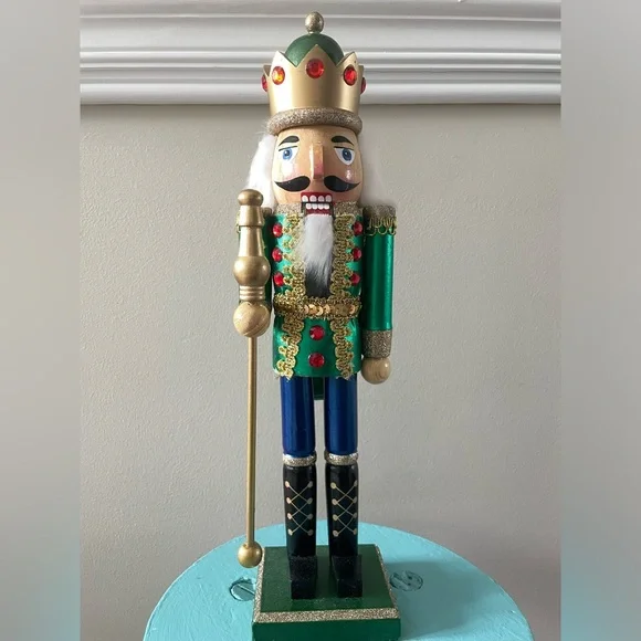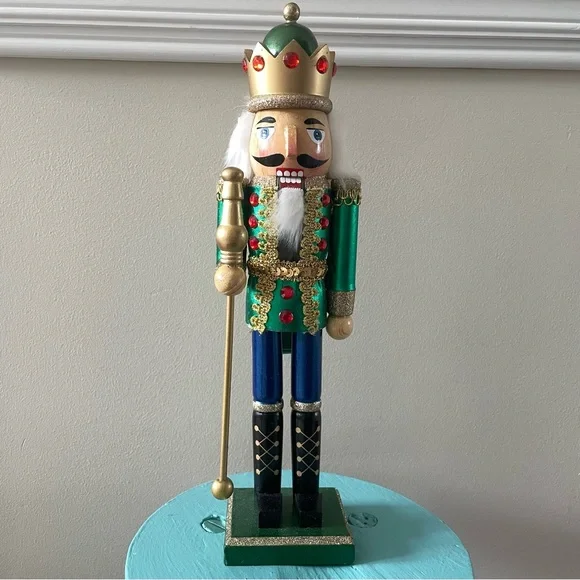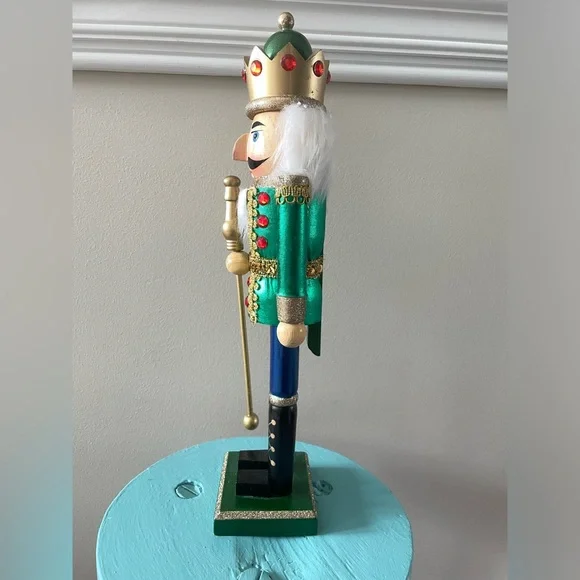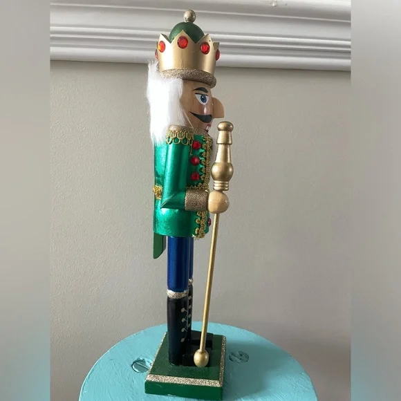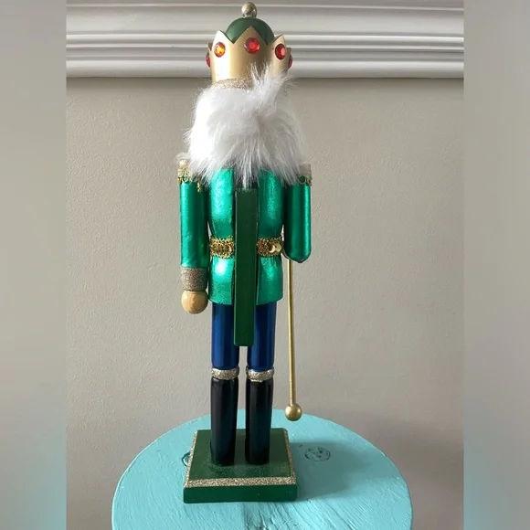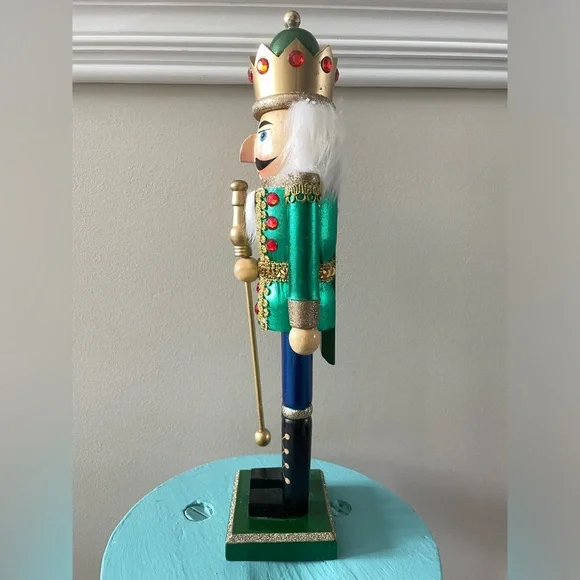This is a Hobby Lobby brand 15” tall wooden holiday Christmas Nutcracker. This Nutcracker has on a jacket that is metallic green with red jewels and gold trim and metallic blue pants. He has a green and gold red jeweled crown on his head and a gold talisman in his hand. In excellent like new condition!