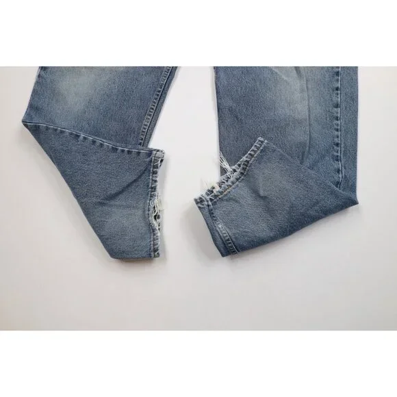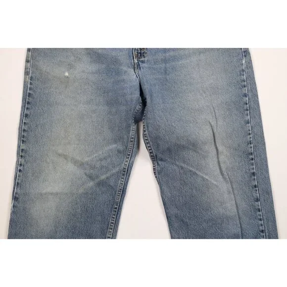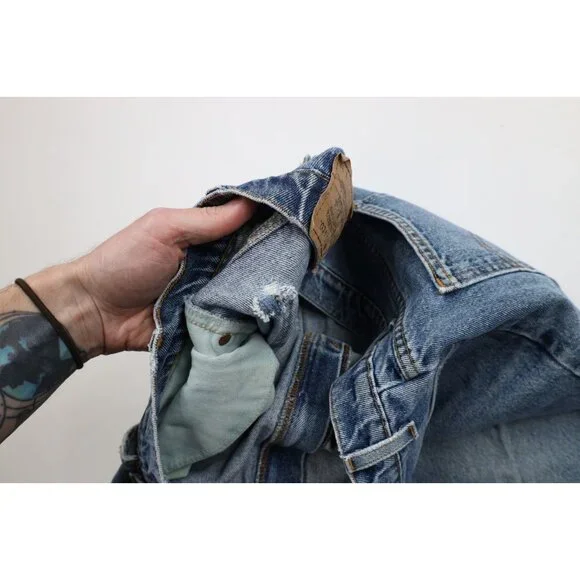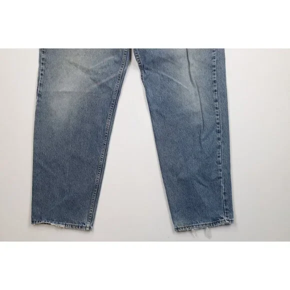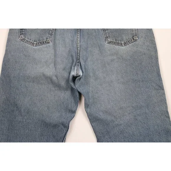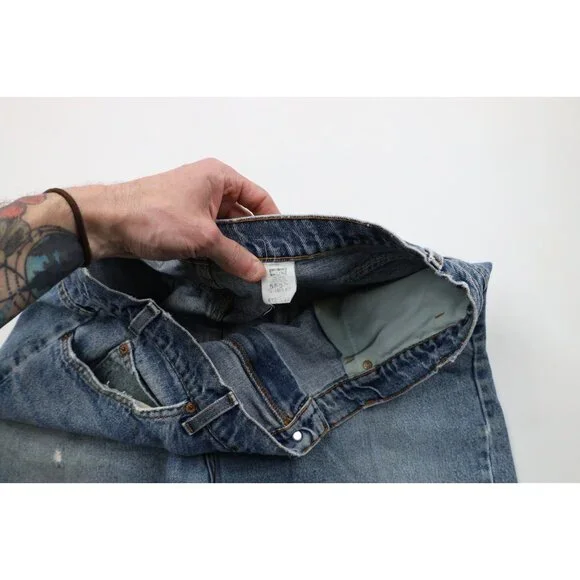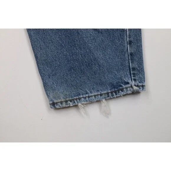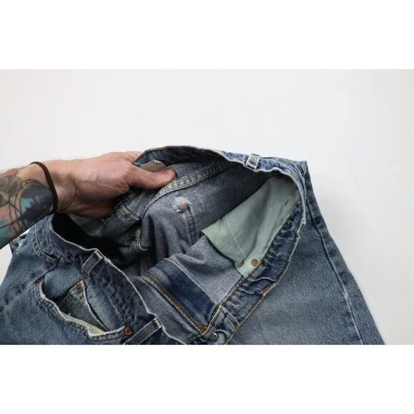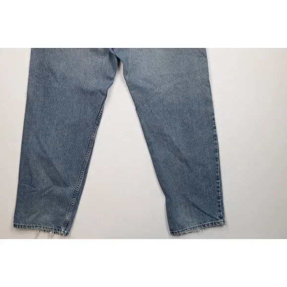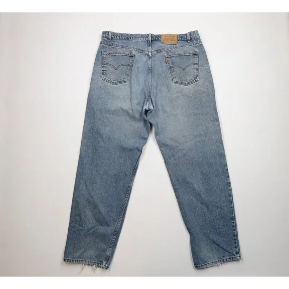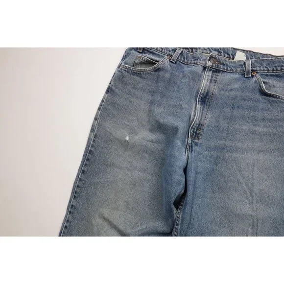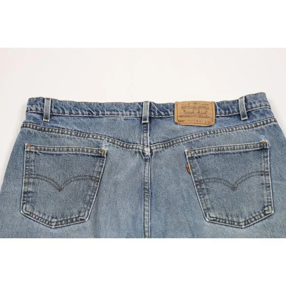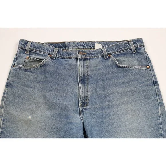 Vintage 90s Levis 550 Orange Tab Mens 40x32 Distressed Relaxed Fit Jeans USAMens JeansThreadbare spot front right leg. Distressing throughout. Blemishes and discoloring front and back. Hole back corner pockets. USA made. Holes crotch/back buttMens size 40 (tagged 42 but measures and fits smaller)Measurements are:20 inches across the waist laid flat32 inch inseam44 inches from top to bottom8.75 inch leg openBlueCottonCheck out my other items in my store!PR245