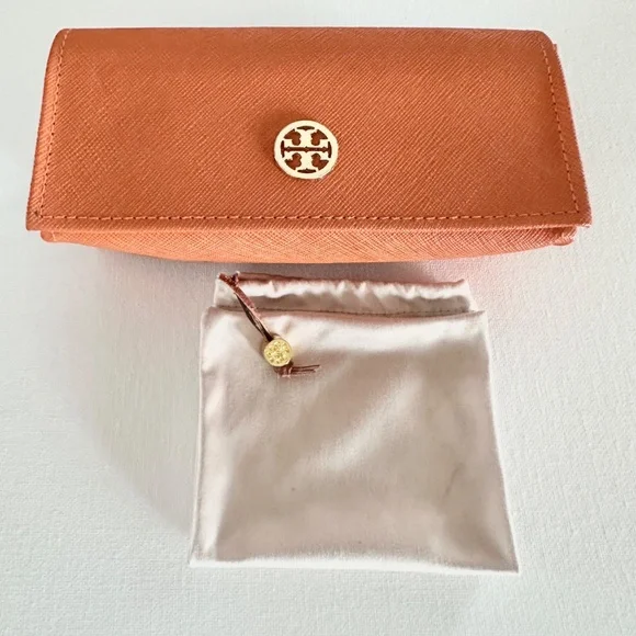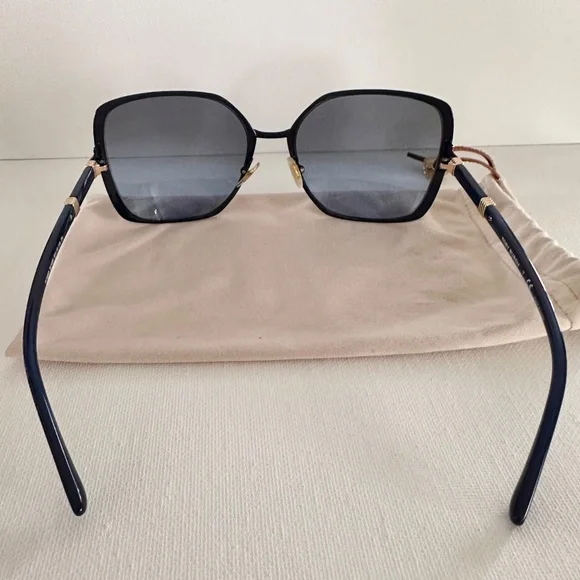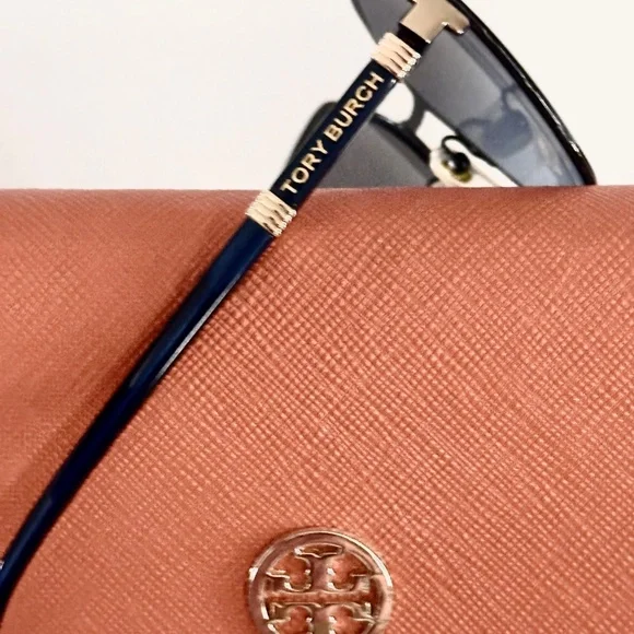 Stylish Tory Burch sunglasses. Blue frames with a chic design. Comes with a brown case.