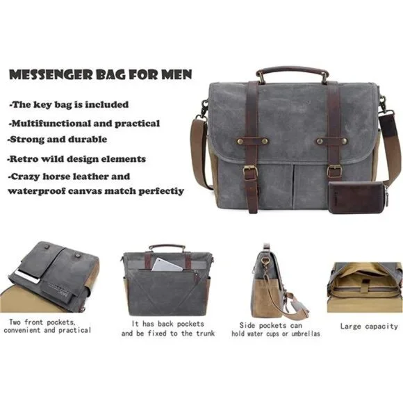 -进口-High Quality Wear-resistant and Waterproof Material: Men's messenger bag is made of high-quality crazy horse leather and special waterproof canvas, which is wear-resistant and durable.Solid bronze hardware.-Unique Appearance Design:The random wrinkles and scratches on the surface of this laptop bag create a unique retro and wild appearance, making the wearer stand out.The laptop tote bag is double fixed by magnetic snap closure and top zipper closure for greater securit.If the messenger bag is too bulging, you can adjust the length of the buckle belt at the front to facilitate the closure of the buckle. You can also use the warm air of the hair dryer to reduce scratches.y.-Adequate Interior Space:This leather messenger bag has 9 pockets to meet your various need. 5 outer pockets and 4 inner pockets for putting your bottle, umbrella, cards, wallet, laptop and anything in their right position.Soft and thick protective compartment Prevents accidental damage to the laptop,and the elastic strap velcro keep the laptop in a safe area.-Size:15.5”L*4.4”W*12.3”H, large capacity for most laptops,Suitable for 15.6 inch and smaller Laptop, the size is perfect for your laptop and all the essential that you need throughout the day. Shoulder strap of canvas messenger bag is detachable and can be adjusted at the most suitable length. Padded handle and strap are also helpful to ease your fatigue.