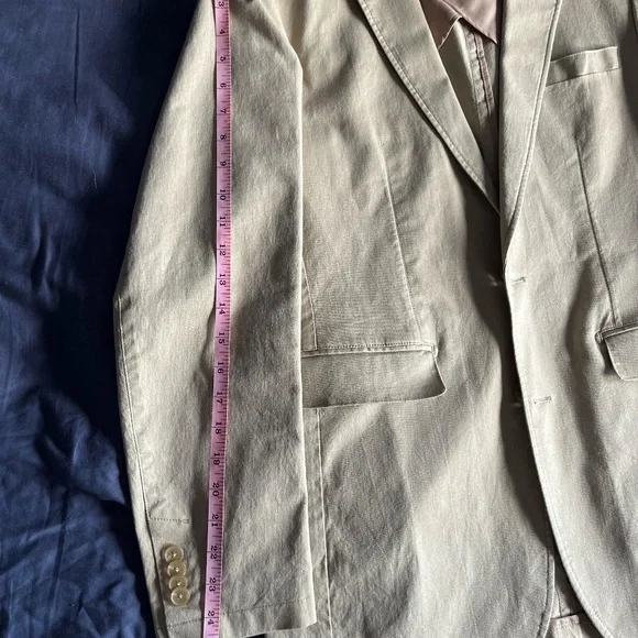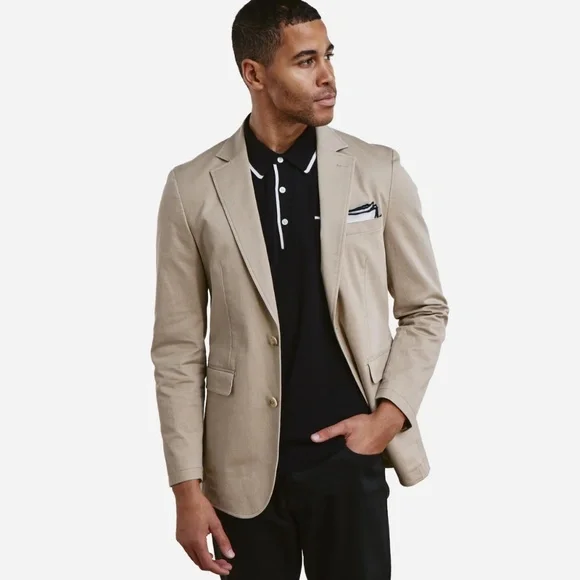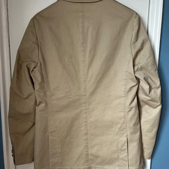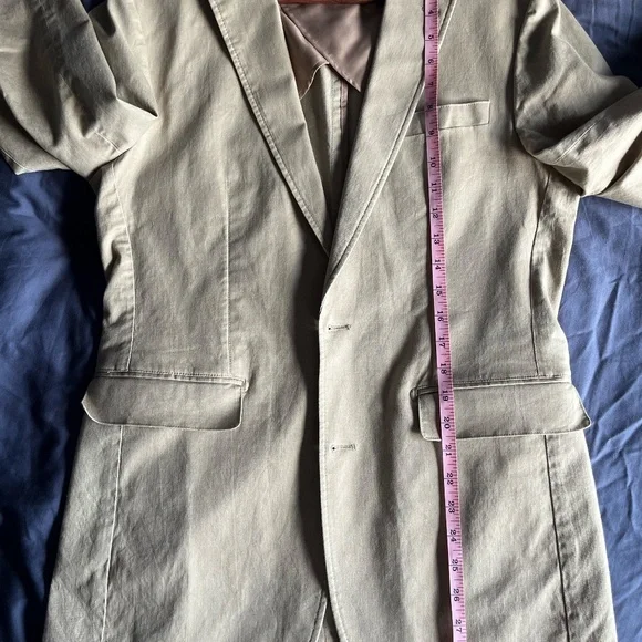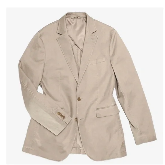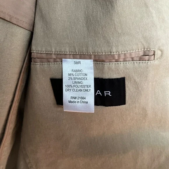 From the manufacturer: This isn't your dad's blazer. Our lightweight men's British tan Miracle Jacket features special design details like a modern chambray undercollar, flap pockets (can be tucked in or left untucked), double vent styling, a top stitched lapel, and soft shoulders. For a relaxed fit, we removed half the lining from our cotton stretch jacket, exposing the perfect craftsmanship and making it the newest addition to our Unlined Collection. Need help finding your jacket size? Check out our Jackets Size Guide.98% Cotton/2% SpandexFabric Care: Dry-clean Only38 Regular (hard to find)Measurements shown in picturesUsed only twice. I no longer fit in it.