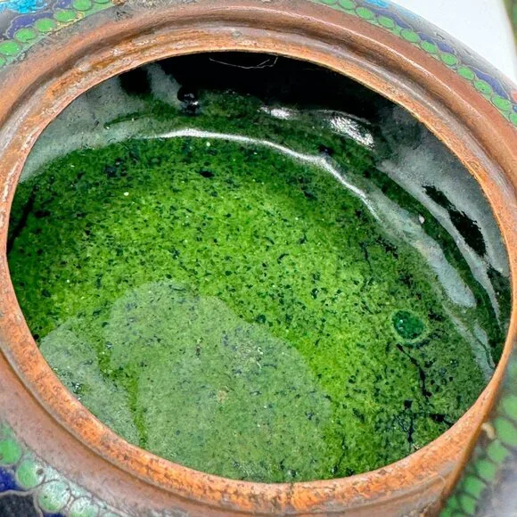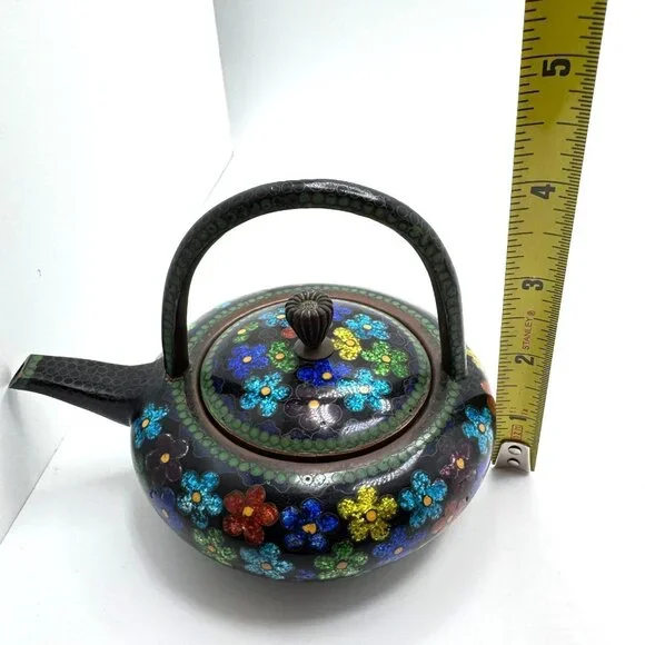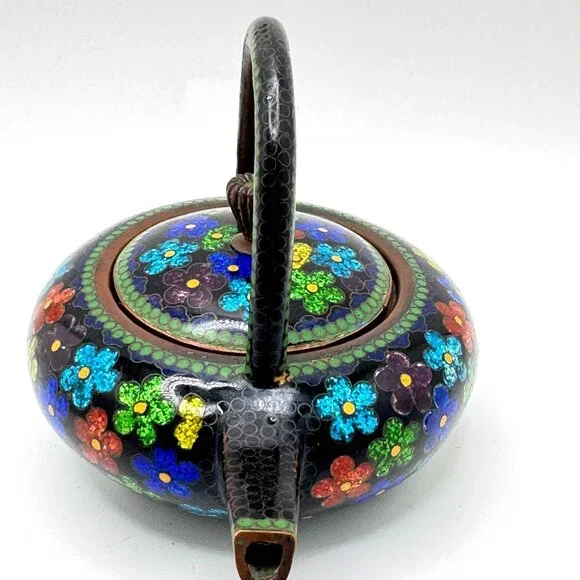 This vintage cloisonné teapot features vibrant enamel floral designs on a black metal base. Its petite size and intricate detailing reflect fine craftsmanship.• Cloisonné enamel technique for detailed floral motifs• Secure lid with decorative flower-shaped knob• Compact design with a sturdy handle for easy pouring• Approx. Dimensions: 5.5" diameter, 4" tallSlight wear on the spout tip and minor patina on metal surfaces, consistent with age. Good pre-owned condition. Vintage or pre-owned items may have minor flaws or wear that are typical with age and use. Minor surface imperfections add to a vintage appeal.Please view all the photos provided as they are part of the condition description. The photos represent exactly what you will receive. Color may differ slightly from how it appears on your screen due to varying monitor settings.