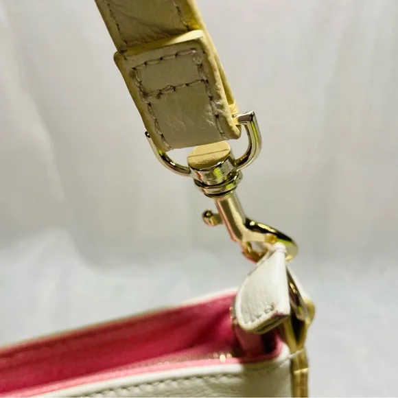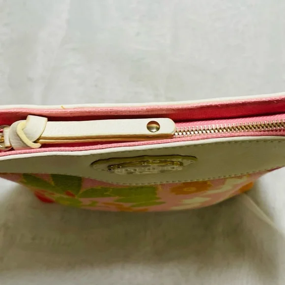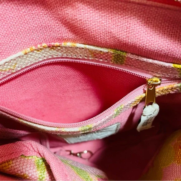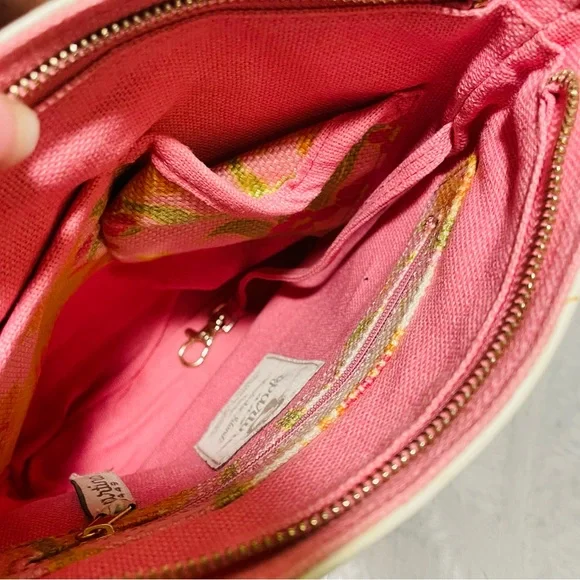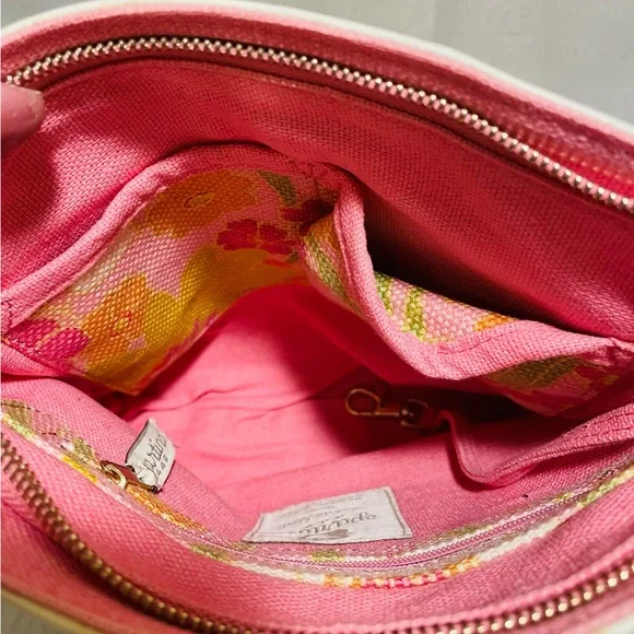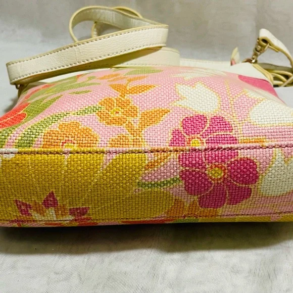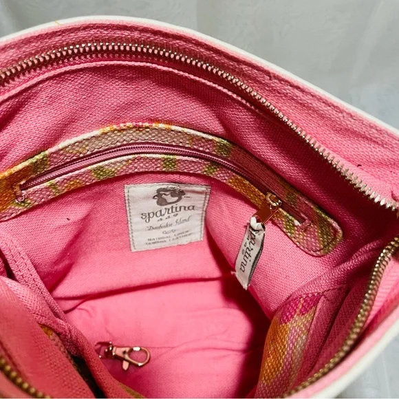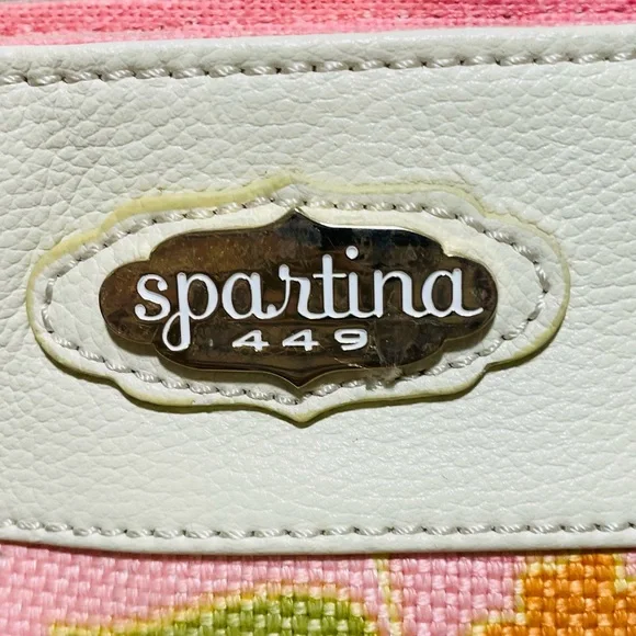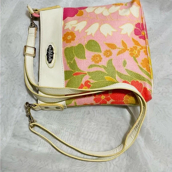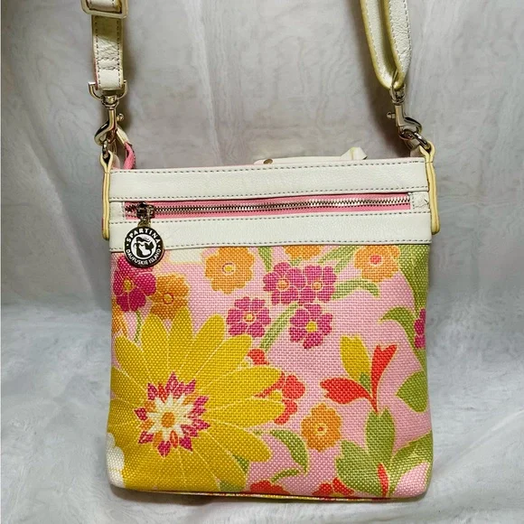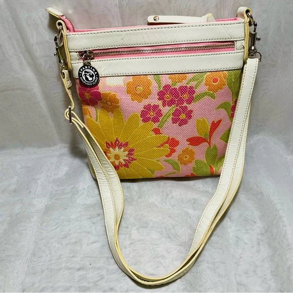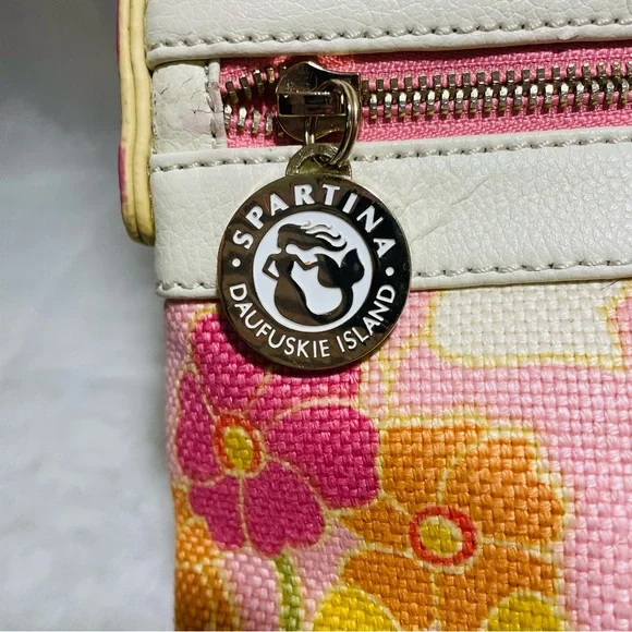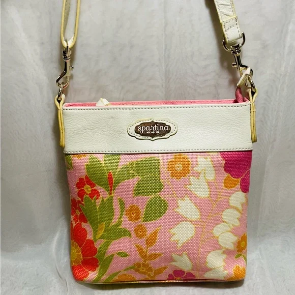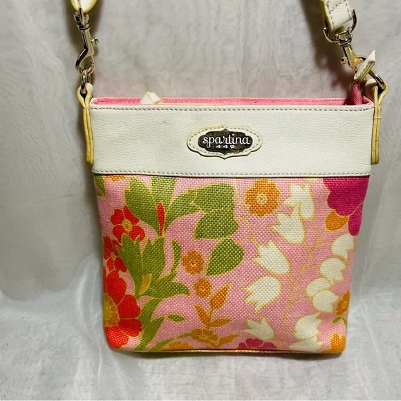 Spartina crossbody with vibrant floral design crafted for fun, ease and comfort - Silver Hardware - Sliver Logo placard on front - Adjustable leather crossbbody strap that is also removable -Top Zip closure - Branded sipper pulls - Exterior zipper pocket - Interior one zip and 2 slip pockets- Printed cotton/linen and top grain Napa leatherApproximately 9 x9 x1.5 with drop of 23 Callouts Gentle used condition with some routine wear on leather