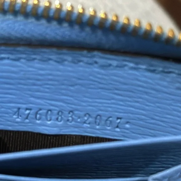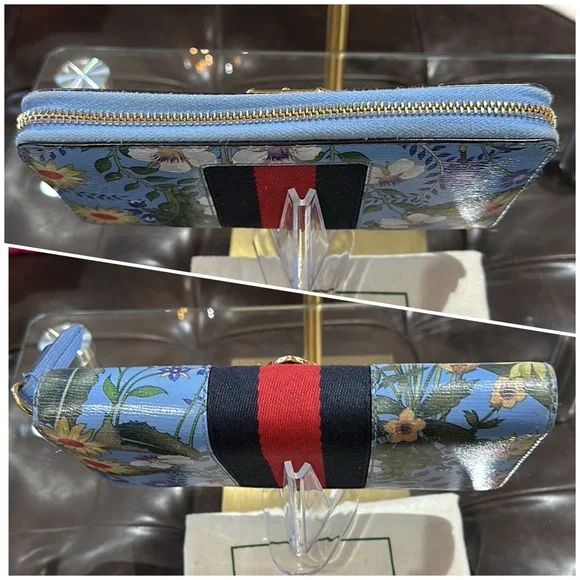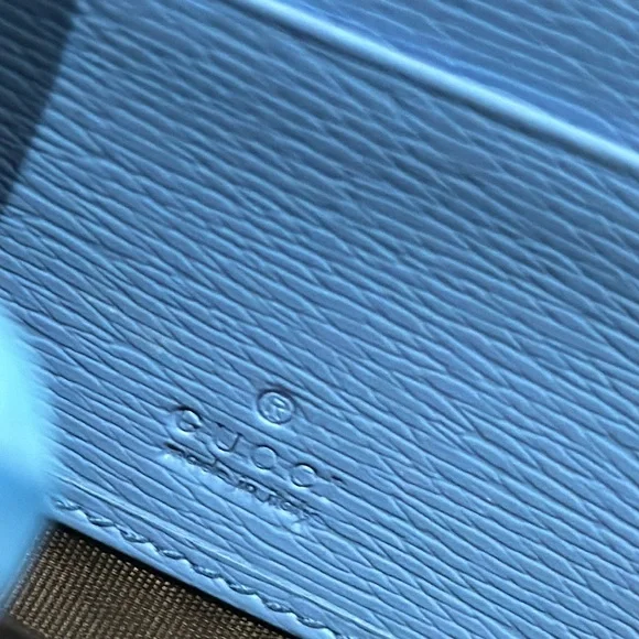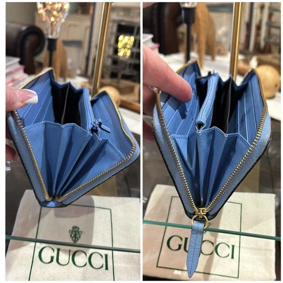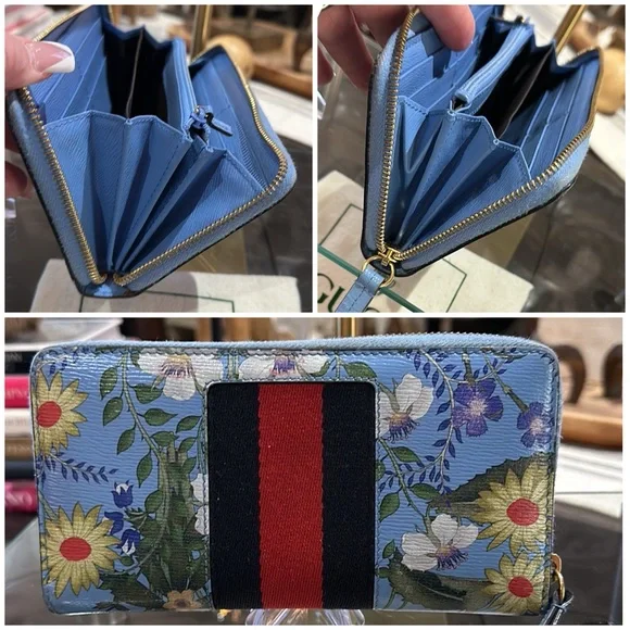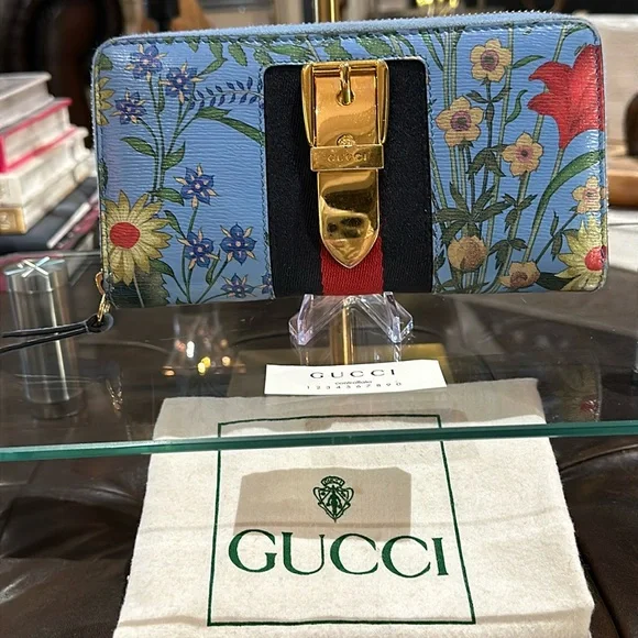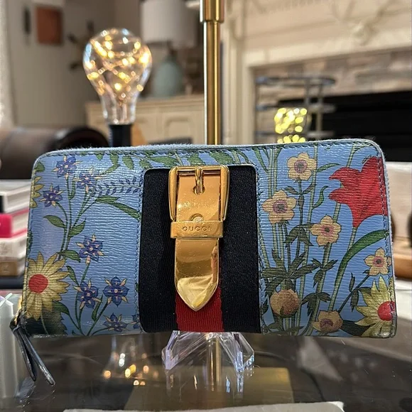 Authentic Gucci Silvie Flora Zip Around Long Wallet w/Sherry Line Buckle Detail. Very good used condition with normal signs of wear. The Sylvie Flora wallet is gorgeously feminine with all of the luxe details you expect from Gucci. Featuring a delicate floral print with signature striped web and buckle detailing, you won’t want to leave this eye-catching wallet in your bag! With ample room for your necessities, use it as a mini clutch to add the finishing touch to your outfit.• Sky blue grained leather exterior with flora print; navy and red sherry line striped web trim with decorative gold buckle• Leather zipper pull• 3/4 zip around closure opens to an accordion sided main compartment with tonal leather and textile lined interior • Central zipped pocket dividing the interior into two main sections with a third center slot for cell phone• 2 bills slots• 12 card slots• Dustbag is NOT included • 7.5”x 4”x 1”• Made in ItalyCondition: VGUC with only faint wear to the exterior leather. Interior leather is beautiful with little to no signs of wear. Buckle hardware is in good condition with faint surface scratches visible upon close inspection. ** There is a nick above the Gucci brand (pictured) ** Glaze is scuffed on top corner and there is light discoloration of fabric from leather edges. NOTE: Gucci control card is included.