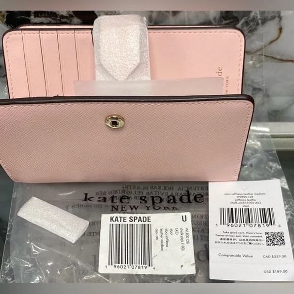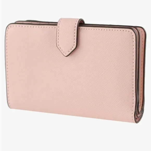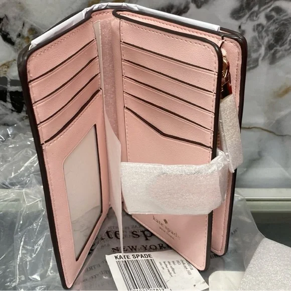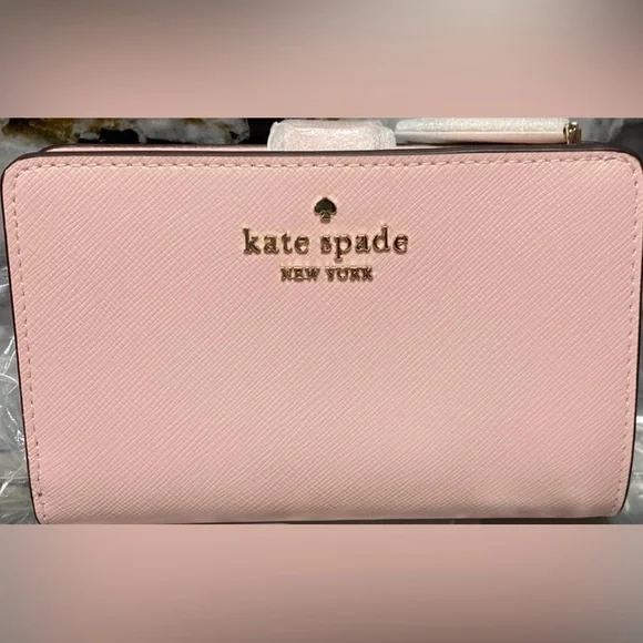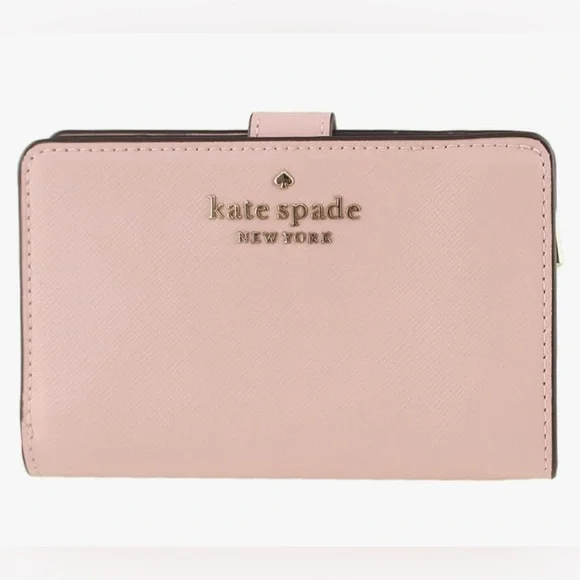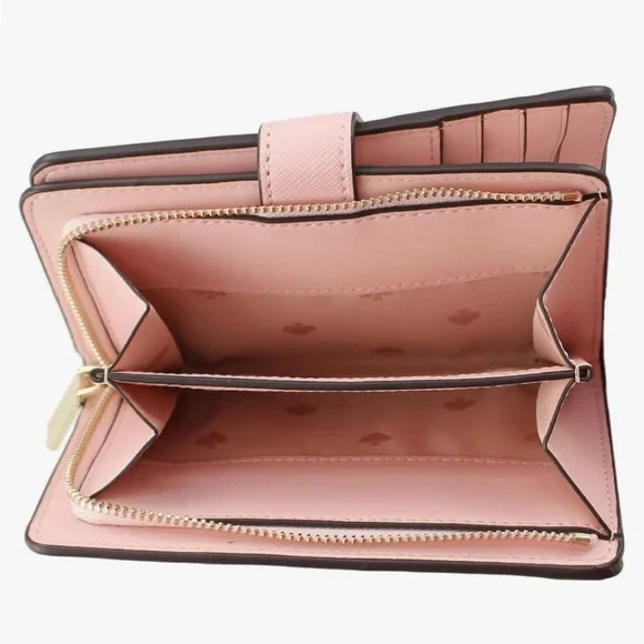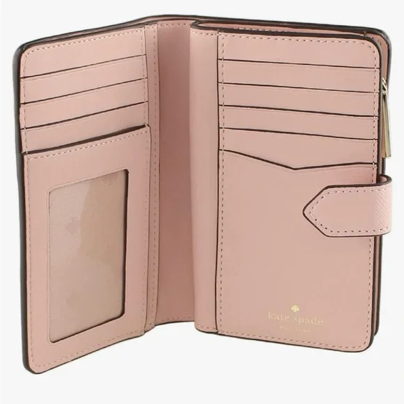 NWT KATE SPADE Staci Medium Saffiano Leather Wallet in Chalk Pink WITH DUST BAG!3.58" h x 5.59" w x 1.22" dsaffiano leatherksny metal pinmount logotwo way spade jacquard lininginterior: 8 credit card slots, id window, 4 slip pockets, 2 bill foldsexterior: l-zip coin compartmentsnap closuredust bag not includedimportedStyle No. WLR00128