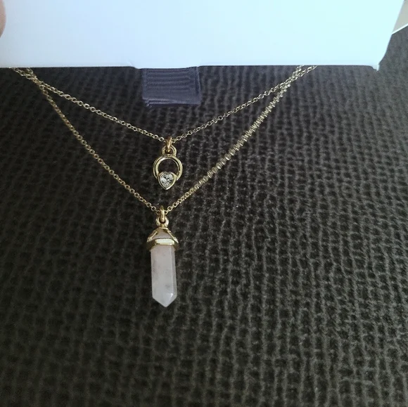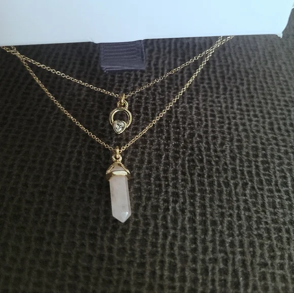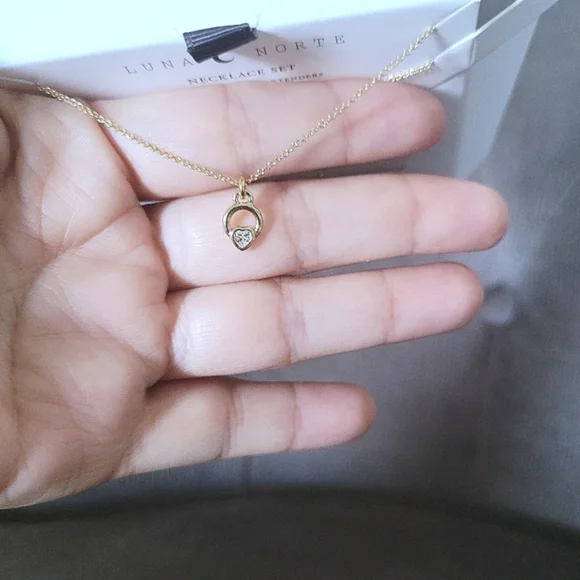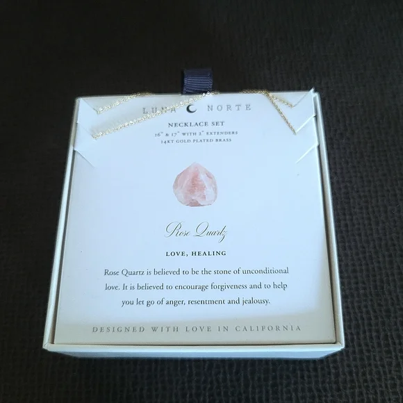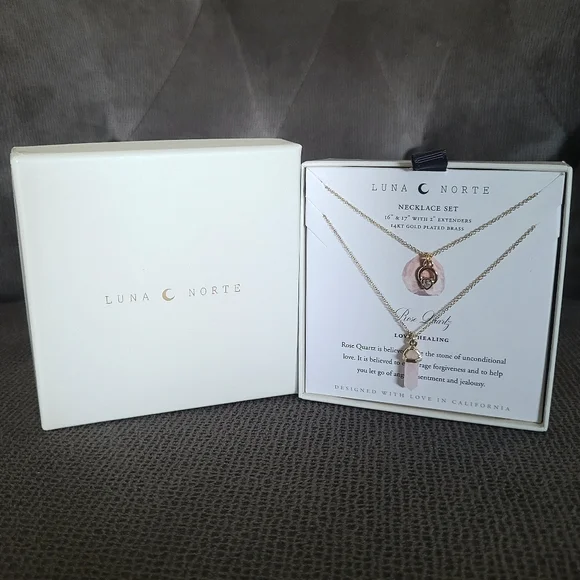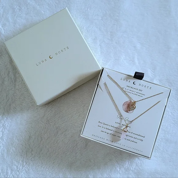 Brand new in box Luna🌙 Norte double✌️ necklace setExcellent condition with no flaws16" and 17" with 2" extenders14K gold💛 plated brass16" chain has a dainty heart at the bottom of an open circle17" chain has rose🌹 quartz bullet pendant Lobster clasp closures🚫Please NO trades or lowballs!🚫*Ask any questions you may have PRIOR to making an offer or purchase please*