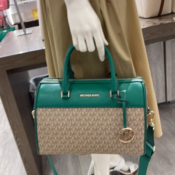 Michael Kors med Duffel Travel - Leather/CoatedMICHAEL KORSTRAVEL35S2GTFU2BPALMETTO GREEN MD DUFFLENew with the tag Authentic Michael Kors med Duffel Travel - Leather/CoatedMade of Leather, Top zip closure with metal pull, Removable and adjustable shoulder strap with 20 to 22 Inch drop, Double handles with 4 Inch Drop, Gold-tone hardware.Michael Kors lettering logo on front, MK medallion hanging tag on the front, Interior: One zip pocket and two open slip pockets. Signature fabric lined, Style: 35S2GTFU2B.Comes with original tags.Approximate measurements: 11.5"(L) x 8"(H) x 6.5" (W);zip top closureinterior: 1 zip pocket, 1 slip pocket