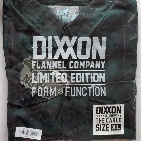 DIXXON Flannel The CARLO Limited Edition Men's Flannel Shirt -XLNEW, In Original PackageLow N' Slow is the only way to go. The Carlo Flannel features an allover green, black, and blue plaid pattern that offers a clean and classic design, while the signature D-Tech™ blend provides the comfort of soft to the touch flannel. Constructed to be breathable for the performance you demand, yet durable for the rugged lifestyle you live.Men’s green, black, and blue plaid patterned flannel shirtFull snap button closureButton sleeve cuffsDual snap button flap chest pockets with utility slot for pens, sunglasses, etc.Green and white Dixxon brand tag on the left chest pocketMachine wash cold with like colorsHang to dry or tumble dry on lowDo not ironSignature D-Tech™ polyester blendImportedRuns big, Refer to size chartRelaxed fitAll sales are final, no returns!