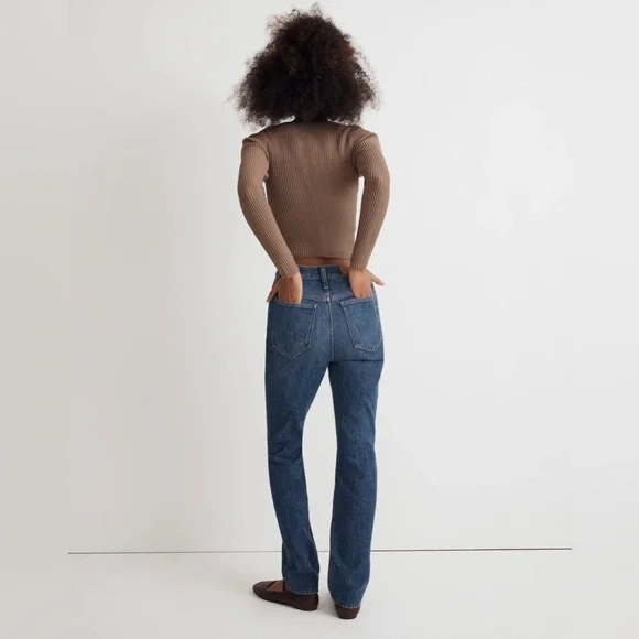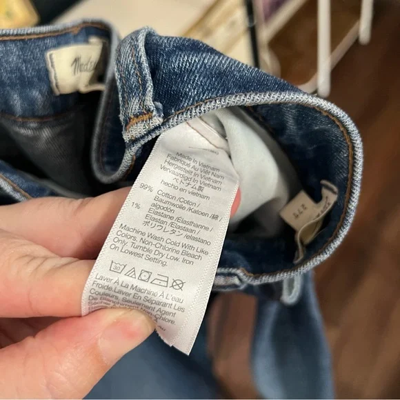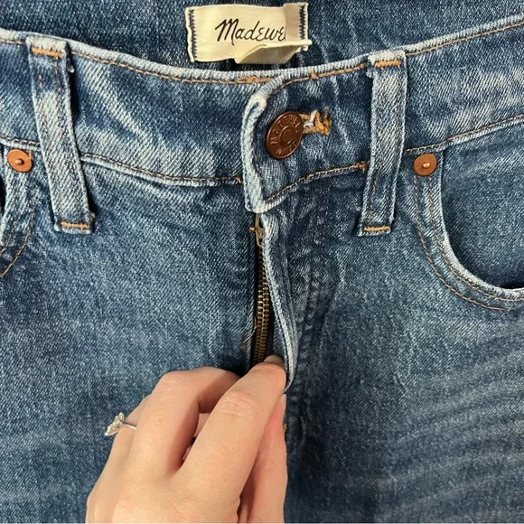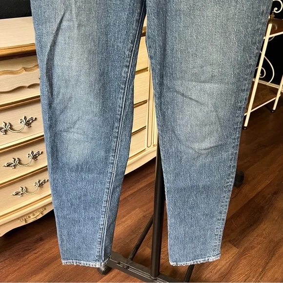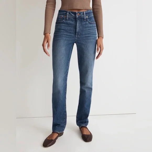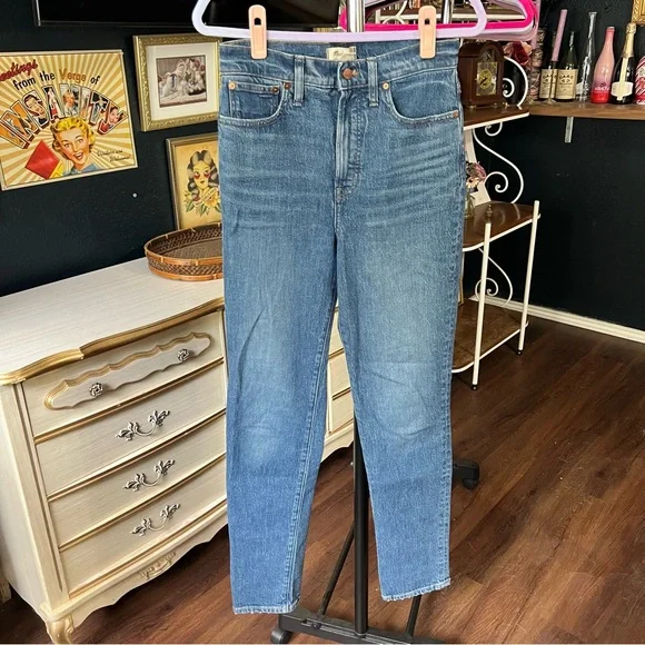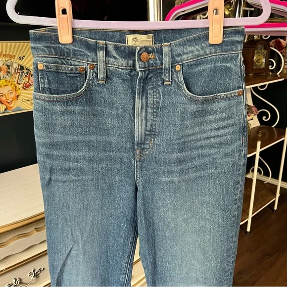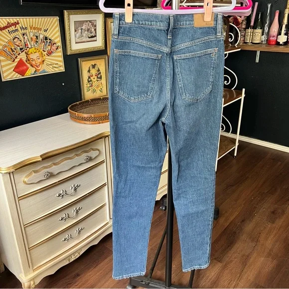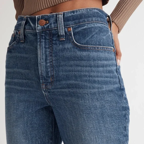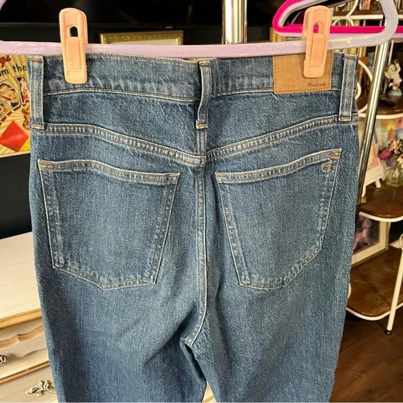 Excellent condition Size 27TThe cut: with their waist-accentuating high rise, MagicPockets™ in front and tapered legs, these are "mom jeans"...if your mom was a '90s supermodel.The fabric: our best-selling Heritage Stretch denim has an old-school look and a touch of give for a perfectly broken-in feel.Dark medium wash with authentic fading. Natural highs and lows on seams.99% cotton/1% elastane.Do Well: By buying cotton products from Madewell, you're supporting our investment in Better Cotton's mission to help cotton communities survive and thrive while protecting and restoring the environment. This product is sourced through a system of mass balance and therefore may not contain Better Cotton.Machine wash.ImportedWaist flat 15”Front rise 12.5”Inseam 31.5”Approx measurements