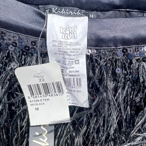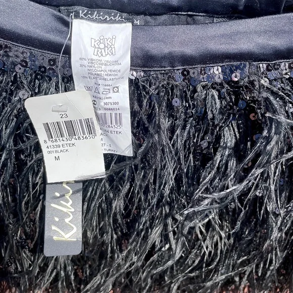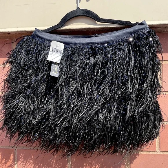 Turn heads with this stunning black feathered mini skirt from KikiRiki New York, it’s brand new with tags. Perfect for a night out or special event, this size M mini skirt is adorned with sequins and feathers for a bold, glamorous look. Add this statement piece to your wardrobe and elevate any outfit with a touch of sparkle and texture.