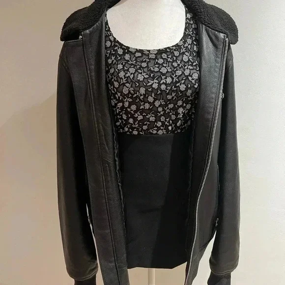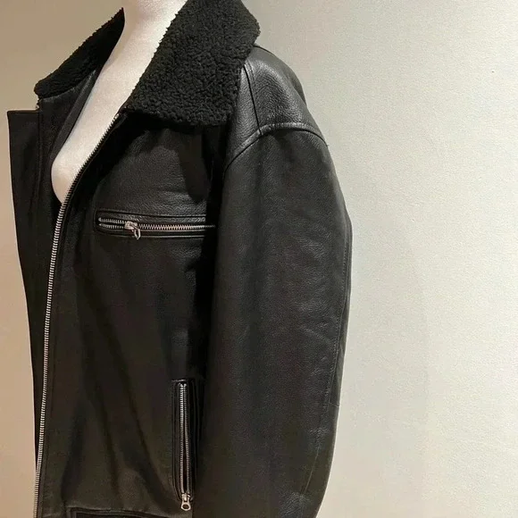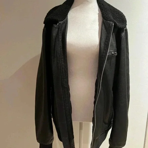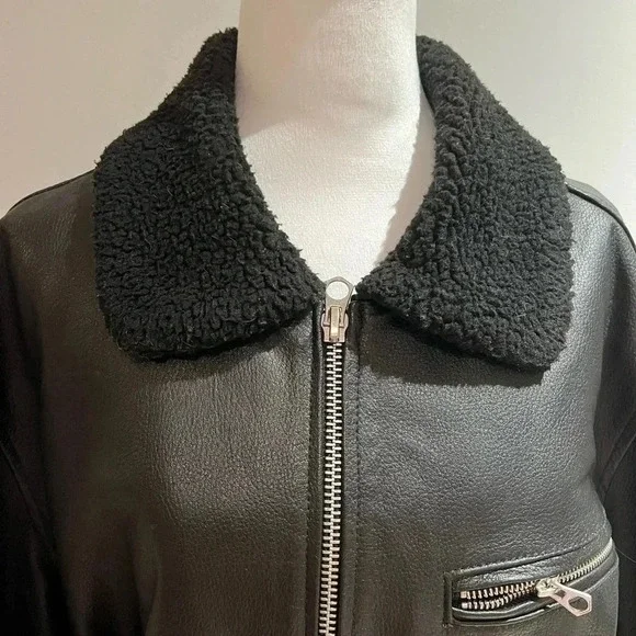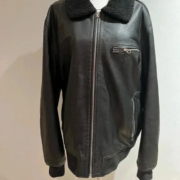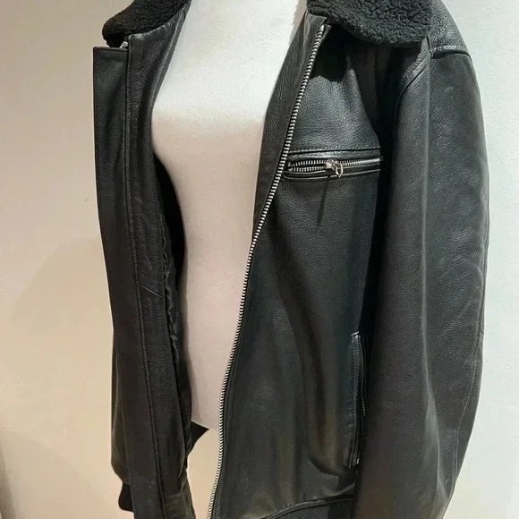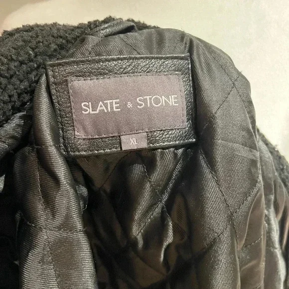 Vintage Slate & Stone Black Leather Aviator Jacket - Size XLElevate your wardrobe with this classic aviator-style jacket by Slate & Stone. Crafted from genuine black leather, this jacket features a cozy sherpa-lined collar, a quilted lining, and functional zipper details. Perfect for layering during colder seasons, its timeless design ensures style and warmth in one sleek package.•Size: XL•Material: 100% Genuine Leather•Features: Sherpa collar, quilted lining, zippered chest pocket, and side pockets.•Condition: Pre-loved and well-maintained.A versatile piece for any wardrobe that pairs effortlessly with casual or edgy outfits.