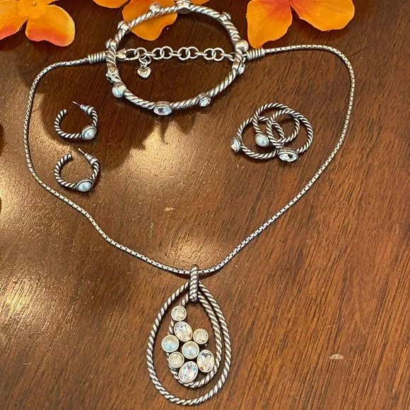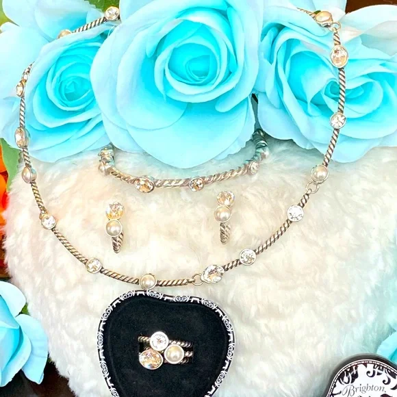 Ultra Rare HTF Brighton “MONTE CARLO Pearl Clear Swarovski Crystal Rope twist Design Necklace, bracelet, earrings & 3 Stack Rings! Wear in the glamorous city of the same name on the French Riviera, wear it as if you were among the beautiful people the-celebrities who go there! This rich mix of pearls & Swarovski are classy & elegant! Perfect for the person who wants it all! I love Monte Carlo all the look of fine jewelry without the ⬆️Price! The other style is a Collection is available in the other listing I have that one in particular and most of the Bracelet as many of you know lol 😂 Very hard to find the entire set grab it while you can & visit my closet for rare Brighton you’ll love!five star seller level two ambassadorBuy here with confidence!"Like"♥️your favorites in my closet to be notifiedof price reductions.Bundle your likes♥️ and save $ $ $ right now why wait, get it today before it's gone.Valentine's DayProfessional, Careerwear, Evening, Event, Evening Wear, Transitional, Versatile, Closet Staple, Wardrobe Staple, Vacation, Cruise, Cocktail, Wedding Guest, Bridesmaid, Bridal Shower, Baby Shower, Special Occasion, Bachelorette, Wedding Shower, Graduation, Glam, Luxury, Upscale, Swarovski, Handcrafted, Country, Cowgirl, Yellowstone, Girl, Rural, Farm, Bohemian, Boho, Gypsy, Shabby Chic, Spring, SummerDavid Yurman